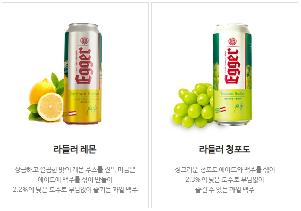 예거 라들러는 오스트리아 맥주로 (주)웰그린라들러에서 수입하고 있으며 라거맥주와 각 맛의 에이드를 섞었다는 점이 특이하다.