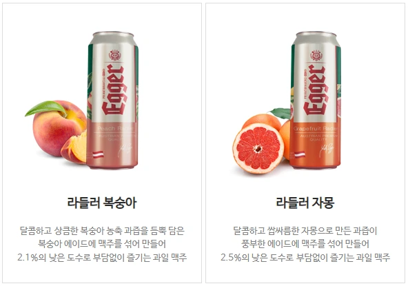 현재 (주)웰그린라들러에서 복숭아/자몽/레몬/청포도로 만든 과즙으로 이뤄진 에이드와 맥주를 섞어 각 2.1/2.5/2.2%/2.3%의 낮은 도수로 부담 없이 즐길 수 있도록 4가지 맛을 출시하고 있다. 용량은 500ml에 가격은 개당 3,300원으로 4개 구입 시 개당 2,500원에 구매 가능하다.