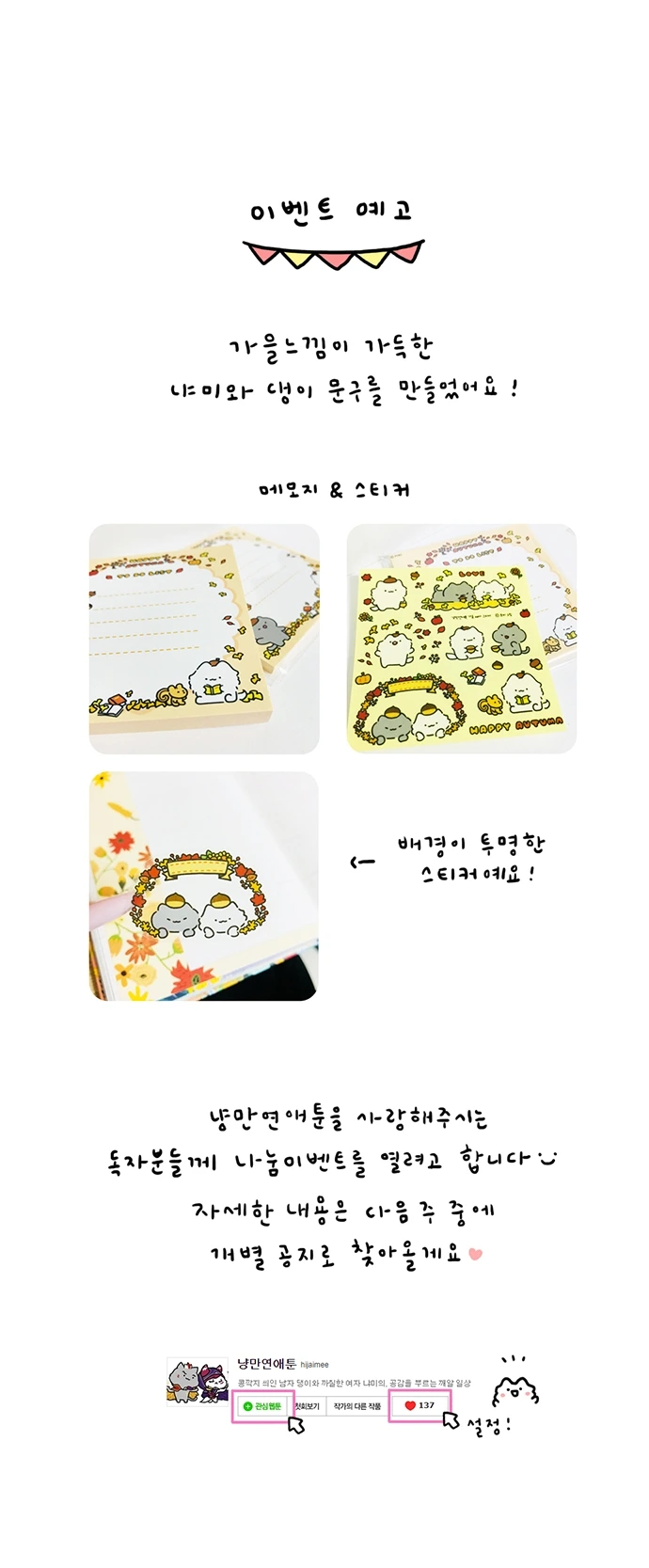 <냥만연애툰>을 그리고 있습니다. 콩깍지 씌인 남자 댕이와 까칠한 여자 냐미의 잔망스러운 연애 웹툰입니다^ ^ 다음 웹툰리그와 네이버 도전만화에서 도전 중입니다!