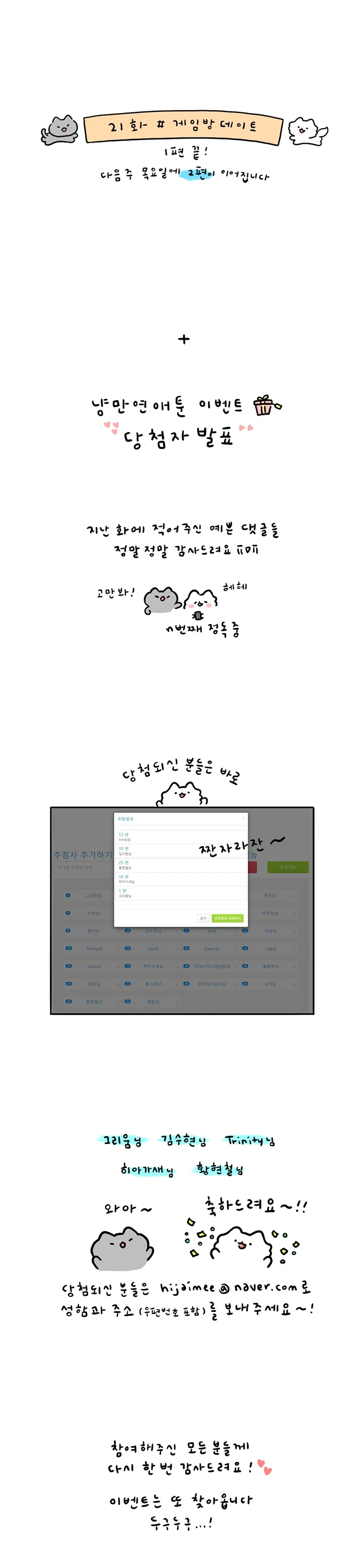 <냥만연애툰>을 그리고 있습니다. 콩깍지 씌인 남자 댕이와 까칠한 여자 냐미의 잔망스러운 연애 웹툰입니다^ ^ 다음 웹툰리그와 네이버 도전만화에서 도전 중입니다!