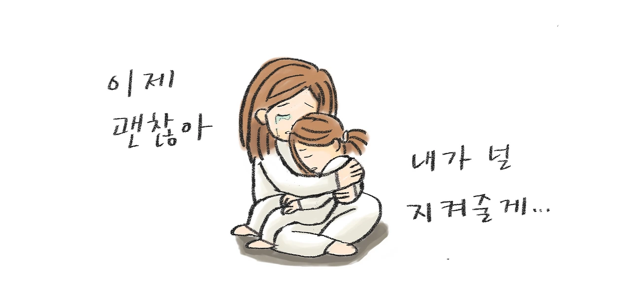 "네 탓이 아니야. 저 놈들이 나쁜 놈들이야. 얼마나 놀랐니. 얼마나 외로웠니. 이제 내가 지켜줄게"