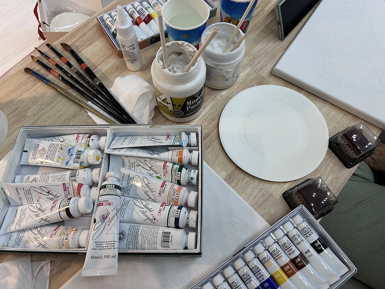 아크릴물감은 처음이었는데, 두쫀쿠같은 식감(?)의 서걱서걱한 하얀 바탕을 캔버스에 펴 바르는 느낌이 좋았다. 게다가 수채화와는 다르게 실패해도 몇 번이고 수정 가능하다는 점도 좋았다.