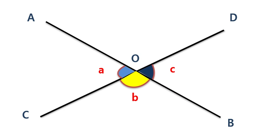 교차점을 O, 그리고… 각 AOC를 a,…각 COB를 b, …각 BOD를 c라 표시한 다음,
