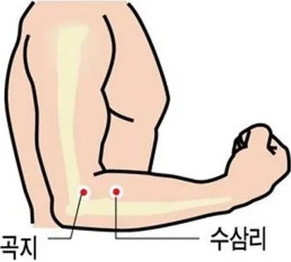 쉽게 배우고 혈자리를 찾을 수 있다. 시력이나 노안으로 고생하시는 분들이 의외로 많다. 이럴 때는 팔굽을 구부려 보자 그러면 안쪽에 가로무늬 줄을 볼 수 있다.이것을 주횡문이라 한다. 그러면 손등이 하늘로 향하도록 곧게 펴고 가로무늬 줄과 팔이 세로로 교차되는 지점이 곡지혈이다.