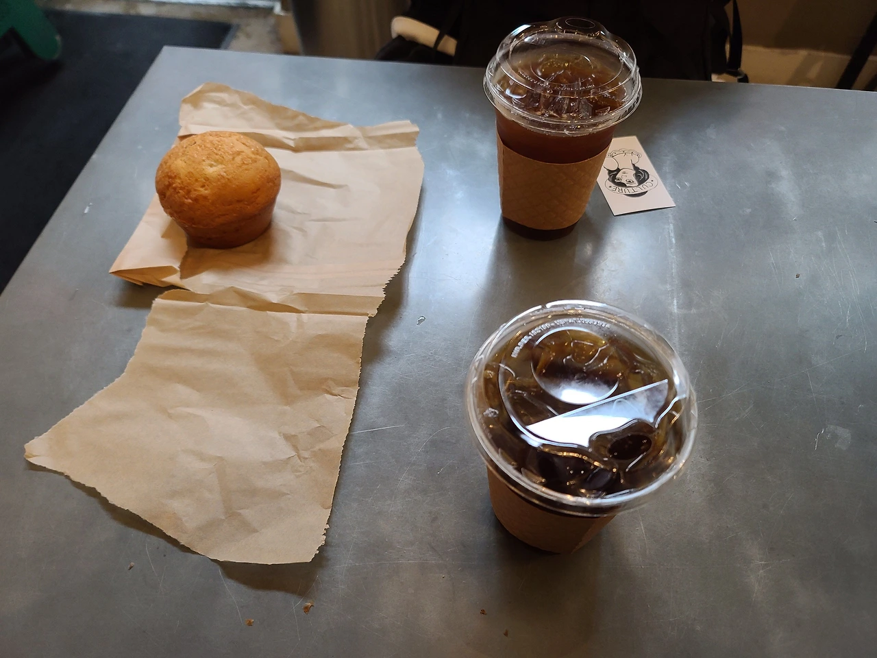 마침 미술관 근처에 평점 높은 라멘 집이 있었고 우리 둘 다. 면 요리를 좋아해서 그 식당에 가 보기로 했다. 식당 이름이 나루토 식당이었는데 형은 이름부터 마음에 든다고 했다. 그렇게 담소를 나누다 보니 커피와 빵이 나왔다. 머핀은 자기가 사는 거라고 편하게 같이 먹자고 해주는 강현이 형 덕에 뉴욕의 커피와 디저트를 맛볼 수 있었다. 콜드브루 커피와 머핀의 조합이 환상적이었다. 또한, 뉴욕의 카페 분위기를 느낄 수 있었다. 각자 분주하게 노트북으로 업무를 보고 있는 사람들, 지인들과 하하 호호 웃으며 담소를 나누는 사람들, 여느 한국 카페와 비슷한 풍경이지만 뉴욕에서 보니 또 신기하기도 하고 기분 좋기도 했다.