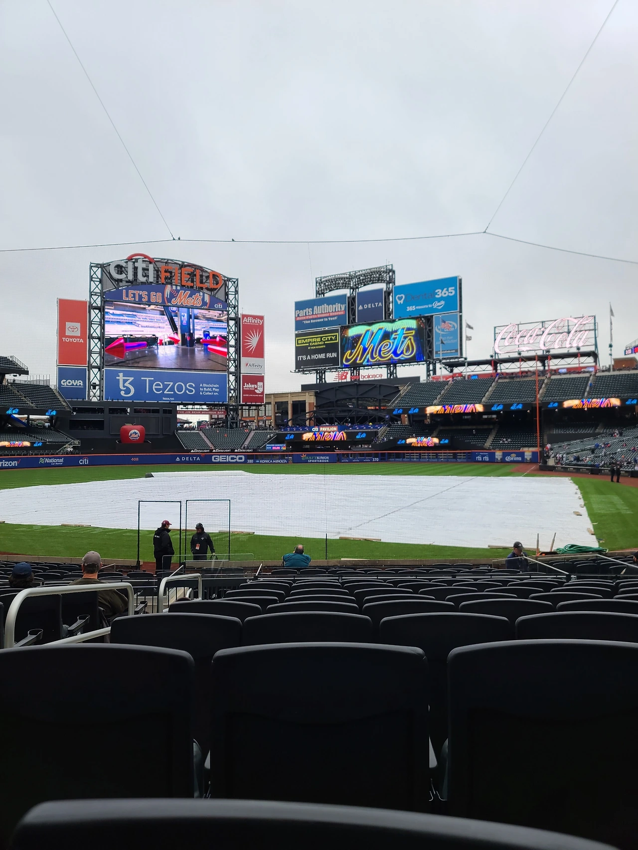 비싼 가격을 지불하고 택시에서 내리자 16,000원이 환불되었고 웅장한 모습의 뉴욕메츠 홈구장인 시티 필드가 나를 맞이했다. 오래전부터 꿈꿔왔던 메이저리그를 오늘 본다. 경기장에 백 팩을 맬 수 없어서 백팩 ㅂ보관소에 찾아가 백 팩을 맡긴 후 경기장 안으로 들어갔다. 비싼 돈을 주고 가장 좋은 자리 중 하나인 포수 뒷 열을 구매했기에 경기장의 멋진 시야가 한눈에 들어왔다. 4시에 경기가 시작하는데 당장이라도 시작했으면 좋겠다. 3시가 넘어서까지 방수포를 걷지 않았다. 아무래도 비가 왔었다. 보니 아직 걷지 않았겠거니 했는데 경기 시간이 임박하고 있음에도 걷질 않는 모습에 약간의 불안감이 엄습했다. 아니나 다를까 갑자기 새 찬 피가 쏟아지기 시작했다. 황급히 실내로 들어왔다. 이쯤에서 야구팬들은 불안감이 엄습하기 시작한다. 혹여 경기가 취소되는 게 아닐까? 하는 불안감 말이다. 이 먼 미국 땅으로 평생 버킷리스트 하나를 이루기 위해 왔는데 취소되면 정말 억울하고 억울할 것 같다. 혹여나 하는 마음에 근처에 있는 직원에게 물어보았다.