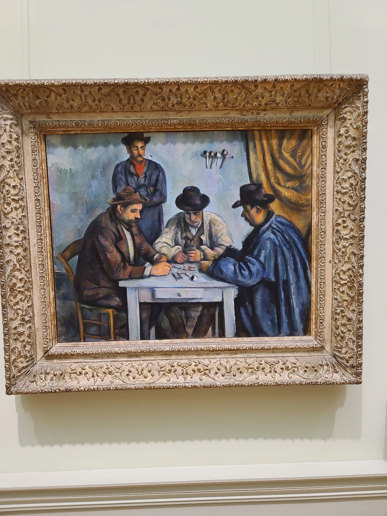 이젠 세잔의 그림을 보고 싶었다. 고흐 관 바로 옆에 세잔 관이 있었고, 세잔 관에 들어서니 세잔의 ‘카드놀이 하는 사람들’이라는 그림이 제일 먼저 눈에 들어왔다. 고흐의 그림은 웅장하며 뭉클했다면 세잔의 그림은 생동감 있고 소름 돋았다. 마치 고대 영화의 필름을 보는 것 같았다. 카드놀이에 정신이 팔린 세 명의 사람들, 그리고 그 관경을 담배 하나 꼬나물고 지켜보는 한 할아버지 그리고 그 옆에 우울한 표정으로 고개를 떨구고 있는 소년, 이 그림은 위험한 도박판의 한 장면을 보는 것 같았다.
