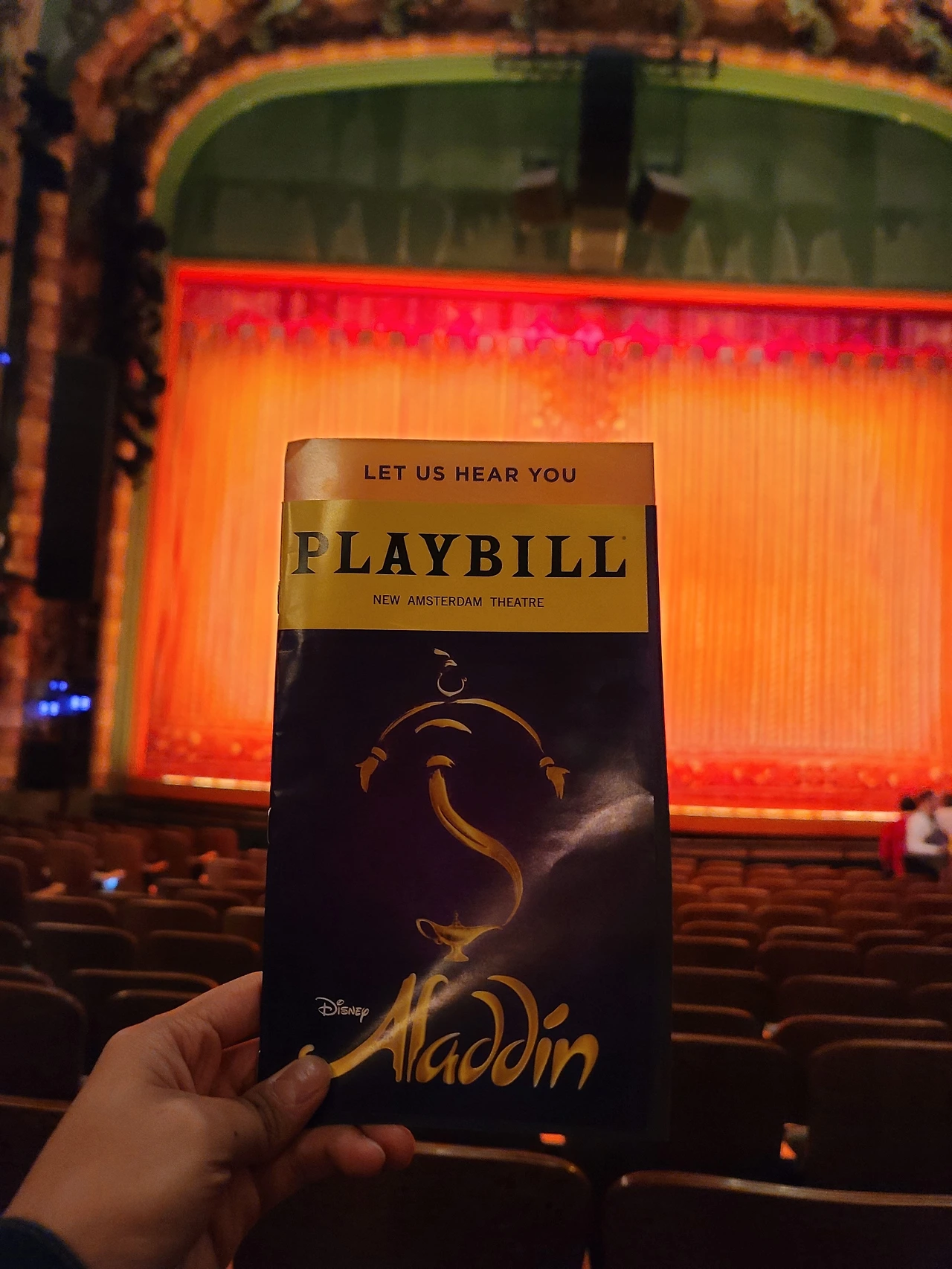 이 정도면 대만족이다! 자리에 앉아서 play bill과 함께 인증샷을 찍었다. 조금 앉아 있으니 자리는 금방금방 찼고 자리에 앉아 공연이 시작되기만을 기다렸다. 그리고 7시, 정확히는 7시 2분에 점등되고 공연이 시작됨을 알렸다. 일제히 환호를 했고 무대를 한 치의 오차 없이 가리고 있던 커튼이 올라가고 본격적으로 무대가 시작되었다. 시작하자마자 감탄할 만큼 무대의 스케일이 남달랐다. 오케스트라의 라이브 연주와 지니가 부르는 ‘아라비안나이트’를 부르기 시작했을 때 내가 느꼈던 기분을 나는 아직도 기억한다. 그들은 나에게 어서 와 여기는 뉴욕이야 라고 말해주는 것 같았다.