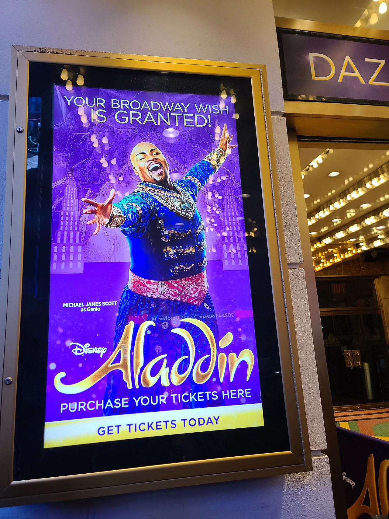 알라딘과 재스민 공주가 양탄자를 타고 날며 메인 곡 중 하나인 A whole new world를 불렀다. 내가 본 가장 감동적이었던 장면이자 이 공연 최고의 장면이었다. 진짜 양탄자를 타고 무대 위를 날아다니는 모습과 정말 애틋하게 노래를 부르는 모습에 감동을, 받지 않을 수 없었다. 이 노래의 제목대로 새로운 세상에서 맞이한 뜻깊은 순간이었다. 공연이 끝난 후 남았던 진한 여운은 어쩌면 당연한 것이었다. 지니의 유쾌한 텐션에서 나오는 따뜻한 성품, 알라딘과 자스민 공주의 사랑 이야기, 악역이지만 유쾌한 장면도 있고 선을 넘지 않았던? 악역들 모든 것들이 감동과 재미였다. 이래서 사람들이 브로드웨이 뮤지컬을 꼭 보라고 했구나. 위에서도 말했지만, 이 뮤지컬은 나에게 “어서 와 뉴욕은 처음이지? 낭만과 환상이 공존하는 꿈의 도시란다. 꿈의 도시 뉴욕에서 마음껏 즐기다가 돌아가렴, 뉴욕에 온 것을 환영해”