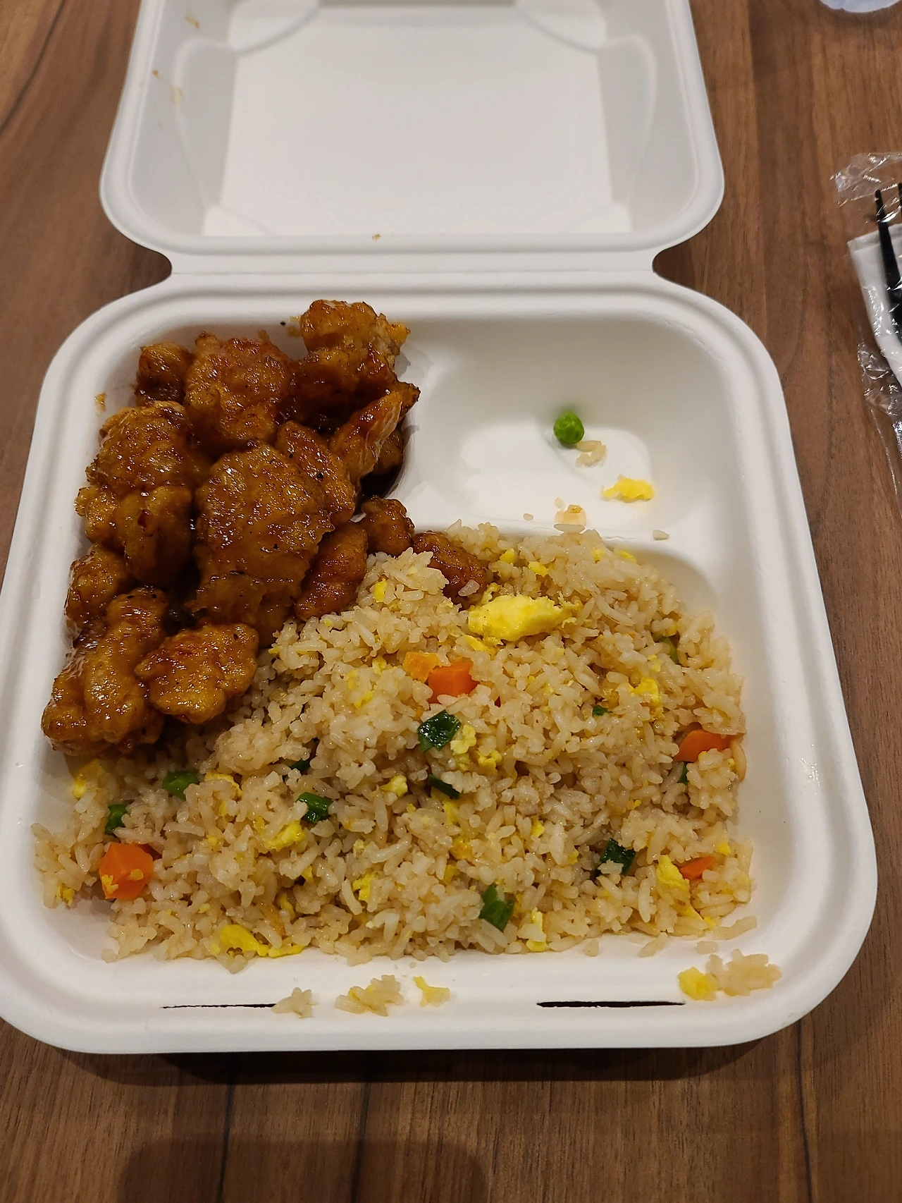 이곳은 음식이 아니라 그릇을 사서 먹고 싶은 음식을 말해주면 그 그릇 안에 담아준다. 그릇의 공간에 따라 메뉴를 2~5 개 정도 주문할 수 있었다. 첫 주문이니 메뉴 두 개를 담을 수 있는 그릇을 사서 볶음밥과 탕수육으로 추정되는 고기를 주문하고 물을 하나 샀다. 가격은 한국 돈 19,000원 정도가 나왔다. 여전히 비싸 보이지만 이곳은 뉴욕이다.라고 머릿속에 주문을 넣었다. 밥을 한 숟갈 떠서 먹고 고기를 집어 먹어보니 천상의 맛이었다. 여기 정말 맛집이다. 미국판 밥도둑이다.