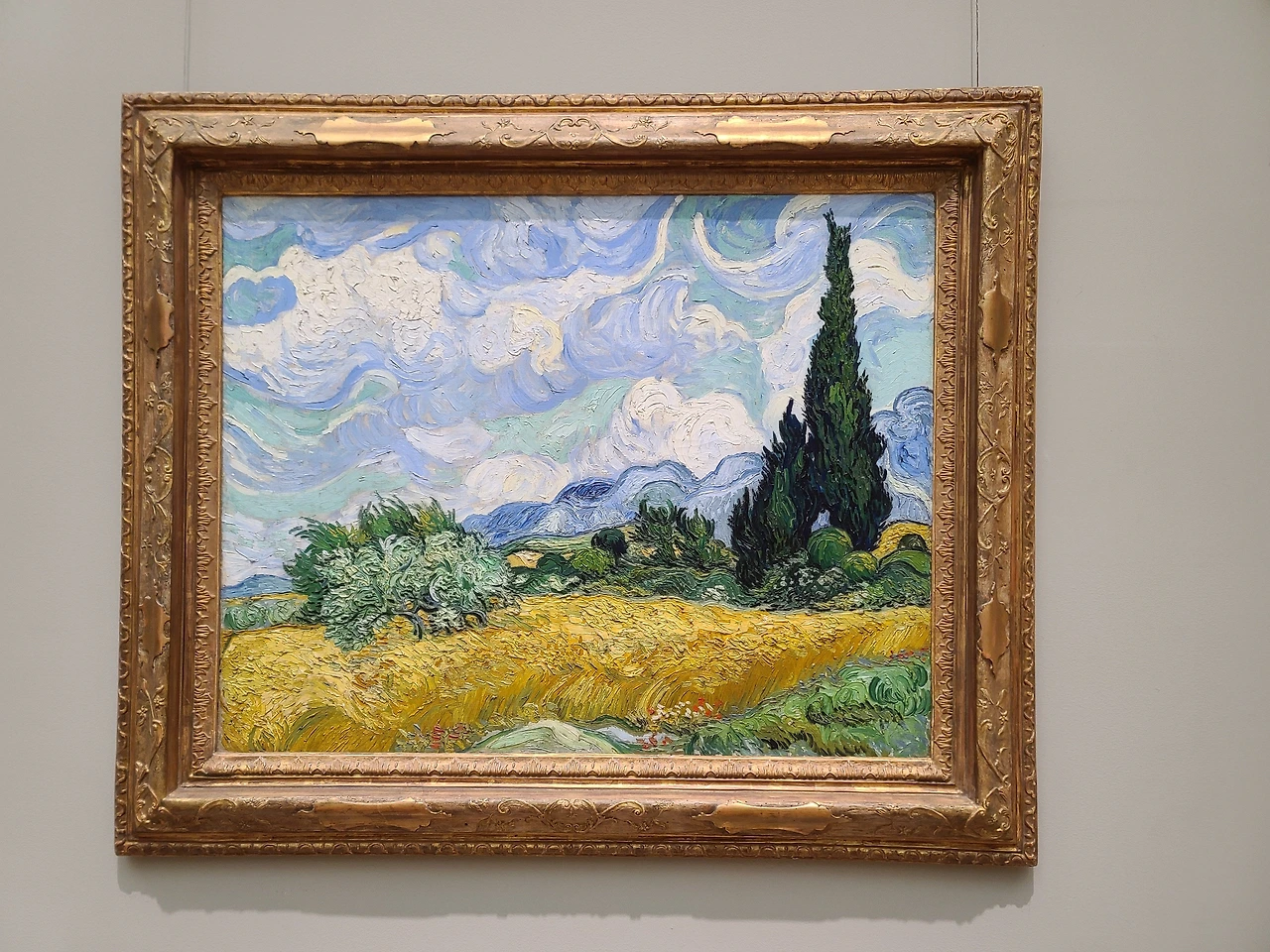 미술관에 올라가자마자 사이프러스가 있는 밀밭을 찾았다. 중앙 전시관 한가운데에 있어서 어렵지 않게 찾을 수 있었다. 나는 아직도 사이프러스가 있는 밀밭을 처음 맞이했을 때의 기분을 잊지 못한다. 웅장함이 묻어나는 그림이었고 고흐의 명성에 걸맞게 많은, 사람들이 그림 앞에서 사진을 찍고 있었다. 그림에 대한 첫인상은 고흐 특유의 격렬한 기법으로 표현한 이 그림이 정말 멋있기도 했지만, 어디에선가 왠지 모를 슬픔도 공존하는 것 같다. 그도 그럴 것이 반고흐가 셍 레미 정신 병원에 입원해 있을 때 그리고 자살하기 1년 전인 1889년에 그린 그림이라고 한다. 나는 고흐의 프로 정신에 존경심을 표하고 싶다. 정신 병원에 입원하게 될 때의 심리적 고통이 얼마나 컸을까? 고흐는 그 모든 고통을 받아들였다. 그리고 그 안에서 병원 밖의 풍경에 영감을 받아 사이프러스가 있는 밀밭과 별이 빛나는 밤이라는 세계 미술사에 길이 남을 그림들을 그려낸 프로 정신에 다시 한번 존경심을 표한다. 내가 보고 싶었던 명작 앞에서 사진을 찍고 다른 그림들도 둘러보았다.