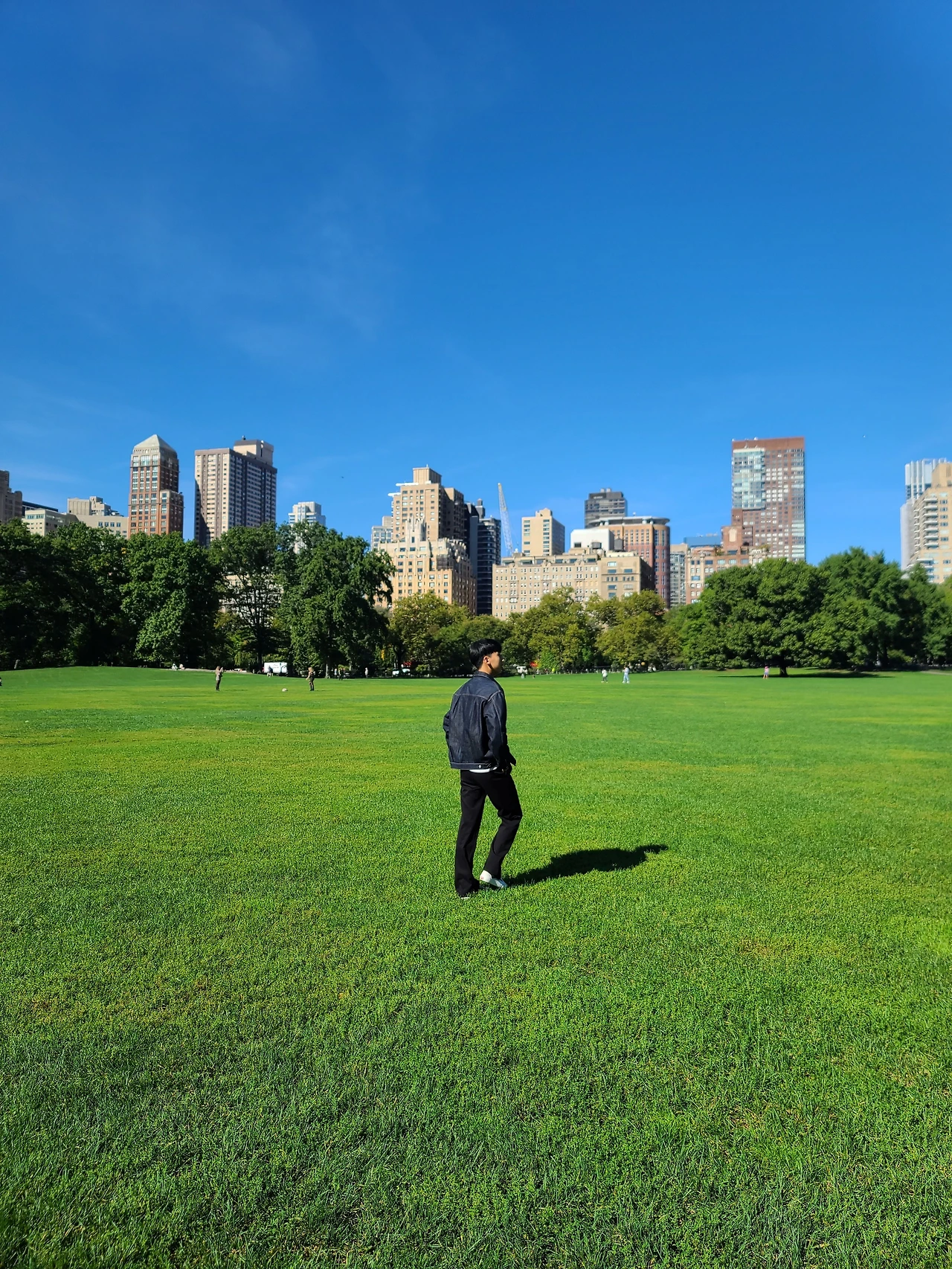 일단 시간이 11시이고 밥 먹을 시간이 다가오고 있으니 센트럴 파크에 먼저 다녀오기로 했다. 화창한 날씨에 보는 센트럴 파크는 과연 어떤 모습일까? 메트로폴리탄의 끝자락으로 가니 센트럴 파크 입구가 있었다. 내부로 들어가 보니 이곳이 세계 금융의 중심이자 빌딩의 숲 뉴욕의 풍경이 맞나 싶을 정도로 힐링과 여유, 치료의 공간 같았다. 상쾌한 공기와 저마다 운동을 하거나 연인과 데이트를 즐기는 사람들로 붐볐다. 또한, 곳곳에서 버스킹을 하며 본인의 악기연주 실력을 뽐내는 사람들도 있었다. 저마다 여유를 즐기고 있으니 나 또한, 평화로운 분위기에 취해 한결 편안해졌다. 숨을 크게 들이쉬며 공기를 마셔보고 주위를 둘러보며 걸었고 드넓은 잔디밭에는 곳곳에는 공놀이를 하거나, 돗자리를 깔고 누워있는 사람들로 붐볐다.