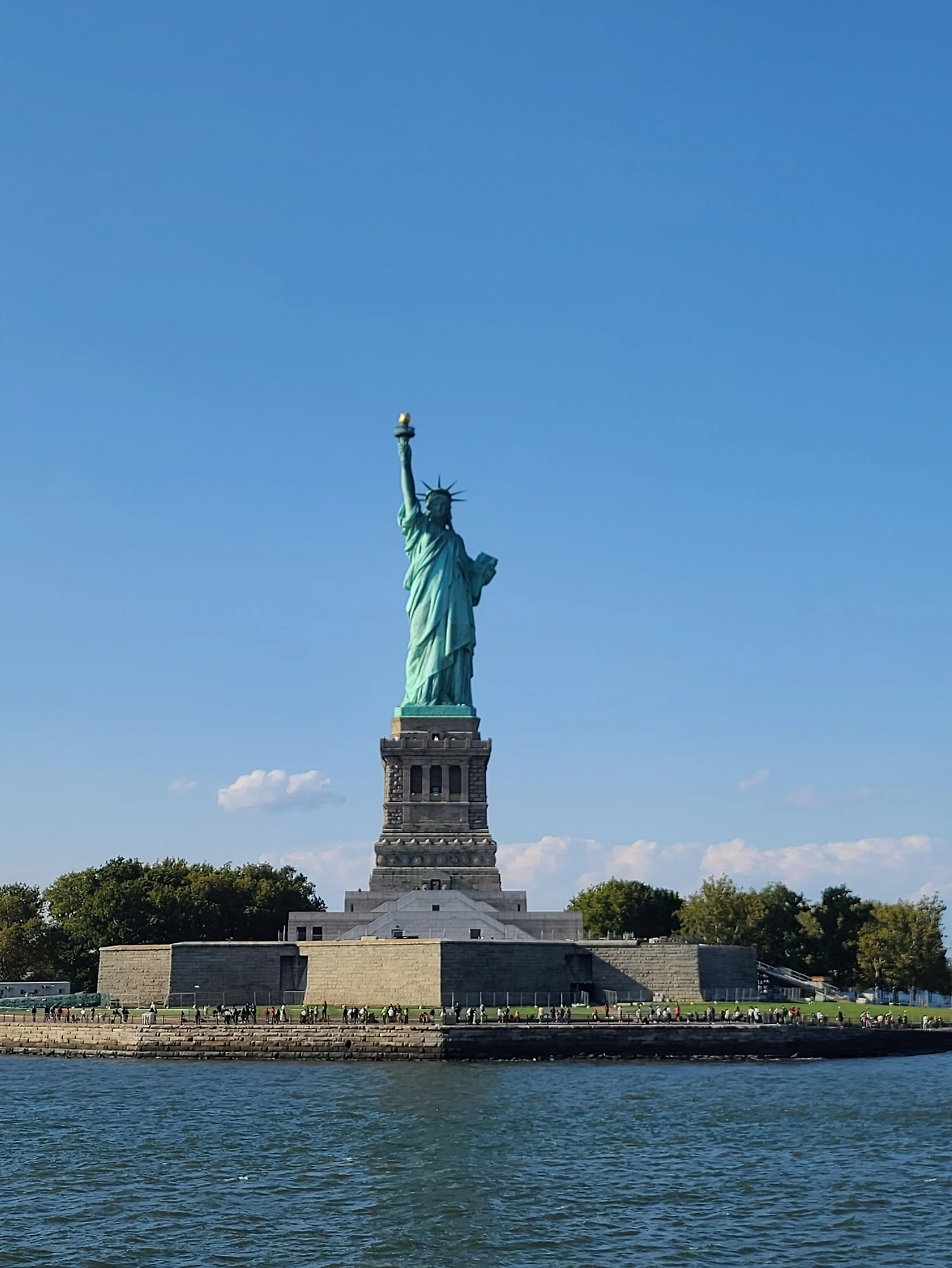 출발을 알리는 패리의 경적과 함께 배가 서서히 출발했다. 앉아 있는 사람은 보기 드물고 전부 서서 자유의 여신상이 모습을, 드러내기를 기다리고 있었다. 출발한 지 얼마 되지 않아 여신상은 자태를 서서히 드러내기 시작했고 연신 사진을 찍기 바빴다. 내가 마주한 첫인상은 생각보다 크고 멋있는 걸크러쉬 같은 느낌이었다. 배에서 보면서 이 각도, 저 각도로 사진을 찍고 섬에 도착! 예상한 대로 사람이 너무나 많았다. 여기에서는 사진을 찍고 간단히 섬만 둘러본 후 돌아가기로 했다. 패리에서 내려 여신상으로 다가갔다. 내가 머리를 한참 올려야 얼굴이 보일 만큼 컸다. 날씨는 구름 한 점 없는 화창한 날씨! 뉴욕 자외선의 기습을 받아 선글라스를 끼고 섬을 돌아다녔다.