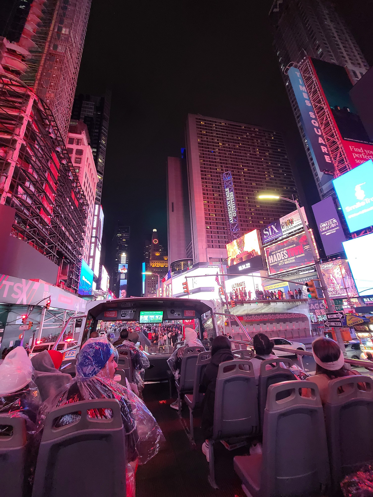 책이나 동영상에서나 봤던 뉴욕의 야경을 직접 적으로 본 순간이었다. 나뿐만 아니라 버스에 탄 사람들 그리고 오늘 만난 분들도 감탄을 자아냈다. 하지만 우리의 감탄은 그리 오래가지 못했다. 시간이 지날수록 추워지고 설상가상으로 비까지 오기 시작했다. 탑승 전 나눠준 우비를 썼다. 뉴욕의 밤에 탑뷰 버스를 타고 맨해튼을 돌던 중 비가 와서 덜덜 떨며 우비를 입은 추억 하나를 만들게 되었다. 1시간 40분이라는 시간은 생각보다 금방 지나갔다. 뉴욕의 풍경들을 보며 하하 호호 웃고 얘기를 하다. 보니 어느새 투어를 마치고 돌아가고 있었다. 정윤 님과 강현이 형에게 어땠는지 물어보니 좋다고? 했다. 진짜 좋았던 거 맞죠? 그랬으리라 믿는다. 새벽 1시가 조금 넘은 시점에서 우리는 버스에서 내렸다. 처음 만난 분들과 함께 밤을 새우며 놀았다. 다시 터덜터덜 타임스 스퀘어로 걸어갔다. 아직까지 뉴욕의 밤을 즐기는 사람들로 북적였다. 우리는 이곳에서 헤어지기로 했다. 물론 서로의 번호를 교환한 후 말이다. 아쉽기는 하지만 우리에게는 내일도, 모레도 있다. 우리 모두 귀국 시기가 비슷하니 여기서 몇 번 더 만나기로 하고 긴 하루를 끝맺었다.