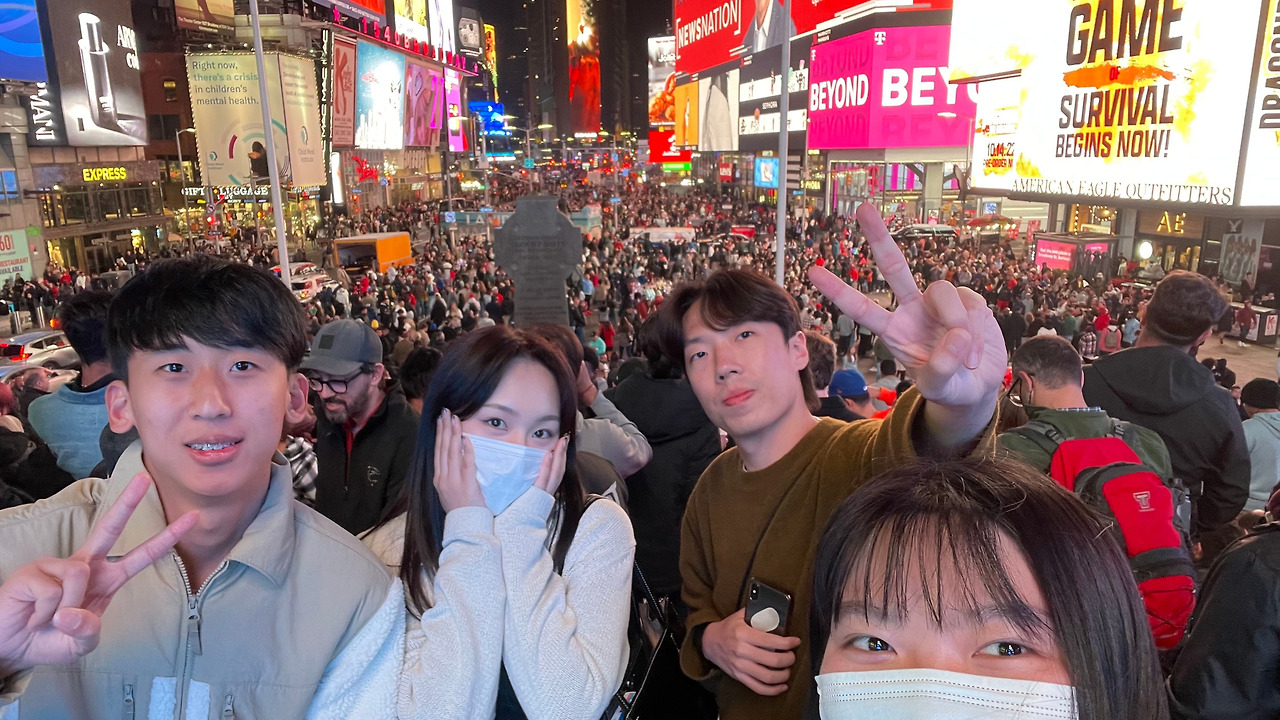 약간의 고민은 됐다. 나는 오늘 잠을 많이 못 잤고 슬슬 피곤해지려 했다. 또 내일은 워싱턴 투어에 참여할 예정이라 아침 일찍 출발해 저녁 늦게 도착한다. 그래서 일찍 잘 예정이었다. 하지만 이렇게 좋은 분들을 만났는데 이대로 헤어지기는 아쉬웠다. 이곳은 뉴욕이고 우리는 20대 청춘 여행객이다. 젊음이라는 든든한 방패가 있는데 뭐가, 두려우랴? 단번에 같이 놀기로 했다. 하지만 어딜 가나 변수가 있기는 마련이다. 밥을 먹고 나오니 오늘 하루, 종일 따뜻했던 날씨는 온데간데없고 춥고 쌀쌀한 날씨가 우리를 맞이했다. 참 신기하다. 오늘은 덥다고 느낄 정도의 날씨였는데 저녁이 되니 또 많이 추웠다. 외투 하나도 걸치지 않은 우리는 단체로 패닉에 빠졌다. 가장 춥게 입고 온 정윤 님 빼고 말이다.