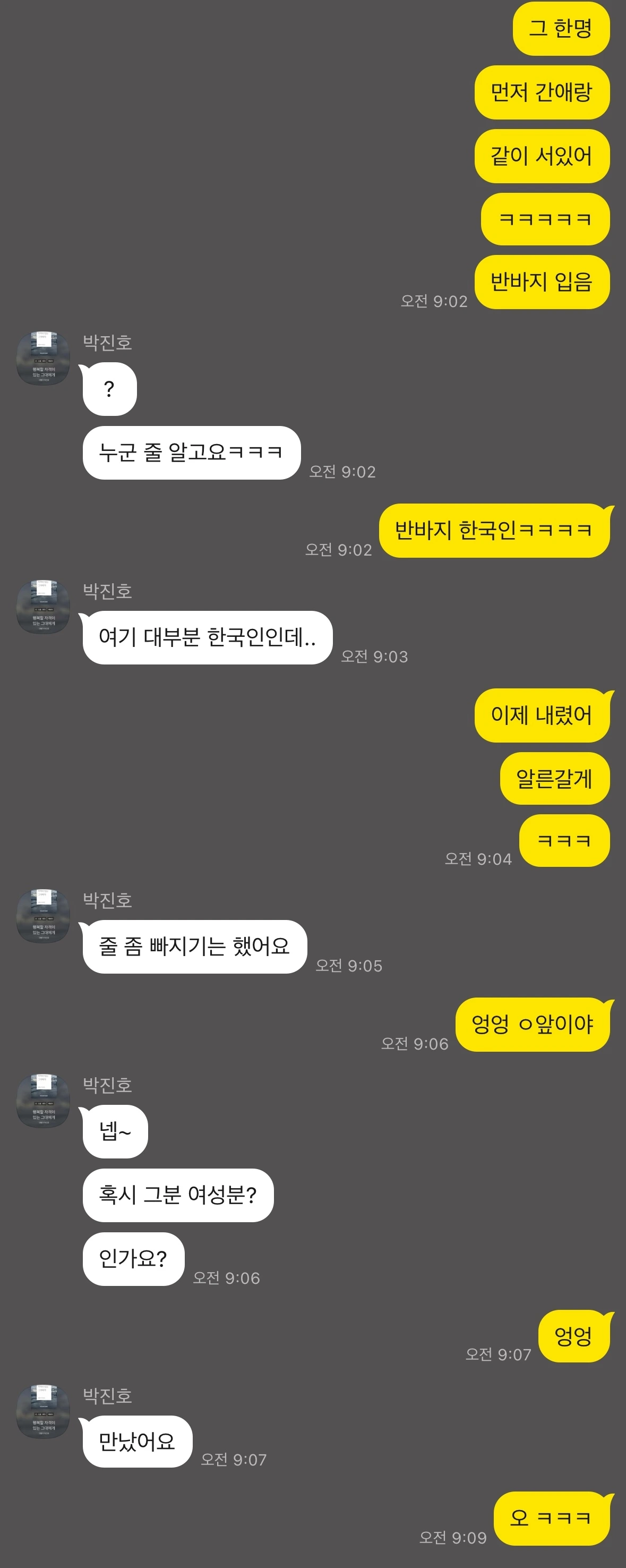 오늘 참 재미있는 일이 많다. 강현이 형도 어이가 없는 상황에 연신 웃었다. 나는 선천적인 샤이보이여서 남한테 먼저 말을 잘 못 거는데,,, 일단 만나보겠다는 메시지를 보낸 후 주변을 살폈다.