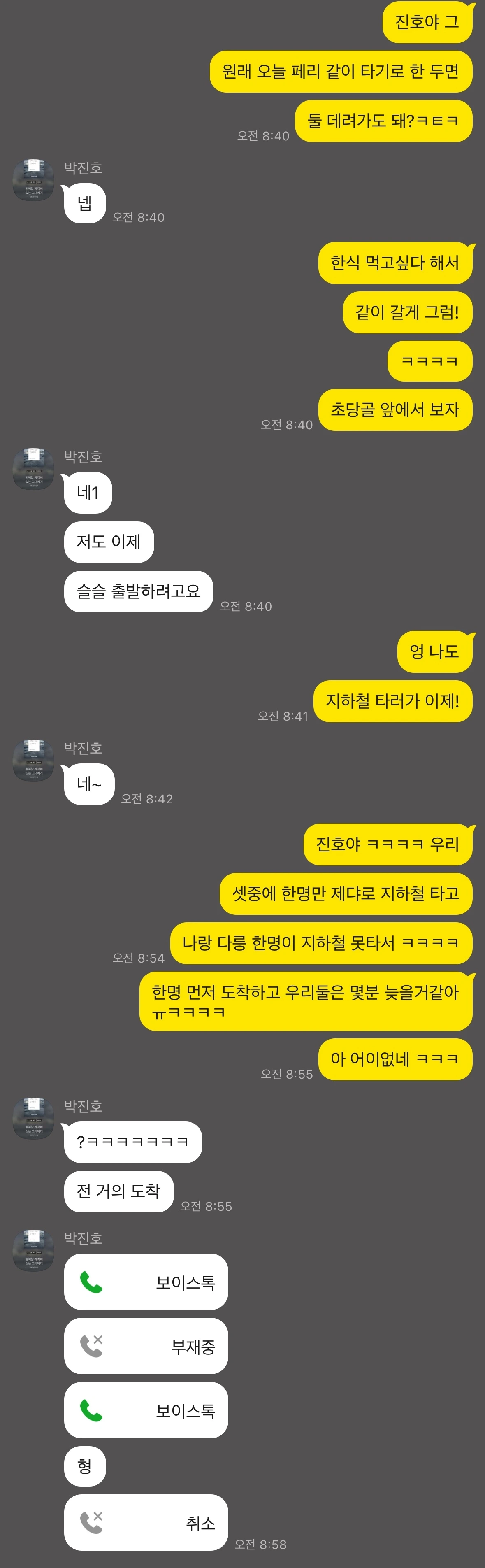 진호야 ㅋㅋㅋㅋ 우리 셋 중에, 한 명만 제대로 지하철 타고 나랑 나머지 한 명이 지하철을 못 타서 한 명 먼저 도착하고 우리 둘은 몇 분 늦을 것 같아 ㅠ 어이가 없네 ㅋㅋㅋ”