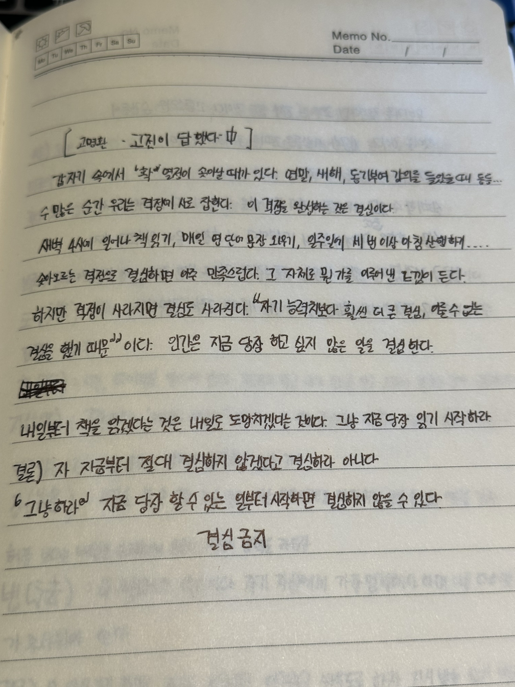 얼마 전 읽은 고명환 작가님의 '고전이 답했다'에 "우리는 우리가 어떤 방식으로 살아야 하는지 알고 있다. 다만 실행하지 않을 뿐이다"