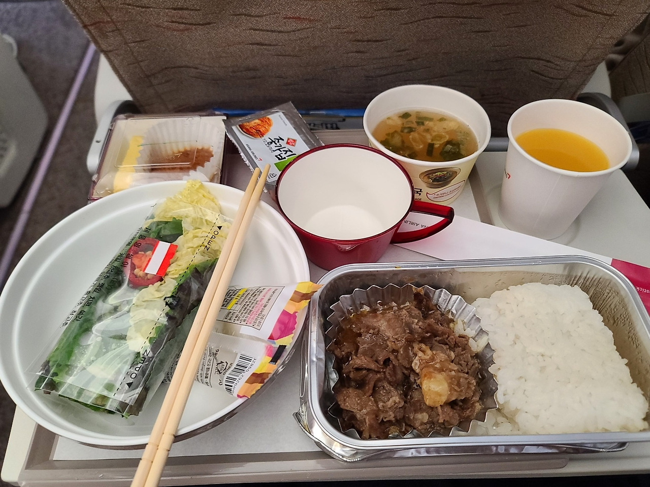 다시 앉아서 미리 꺼내두었던 나태주 시인님의 시집을 폈다. 한마디 한마디 감성적인 시들을 읽다 보니 출발 알림 방송이 나오고 서서히 비행기가 출발했다. 이륙할 때쯤 다시 눈을 감고 잠을 청했다 한 30분 정도 잤나? 기내식이 나온다는 방송을 듣고 잠에서 깼다. 그래 밥은 먹고 자야지~ 불고기 덮밥을 주문하니 예쁜 그릇에 쌈 채소까지 나왔다.