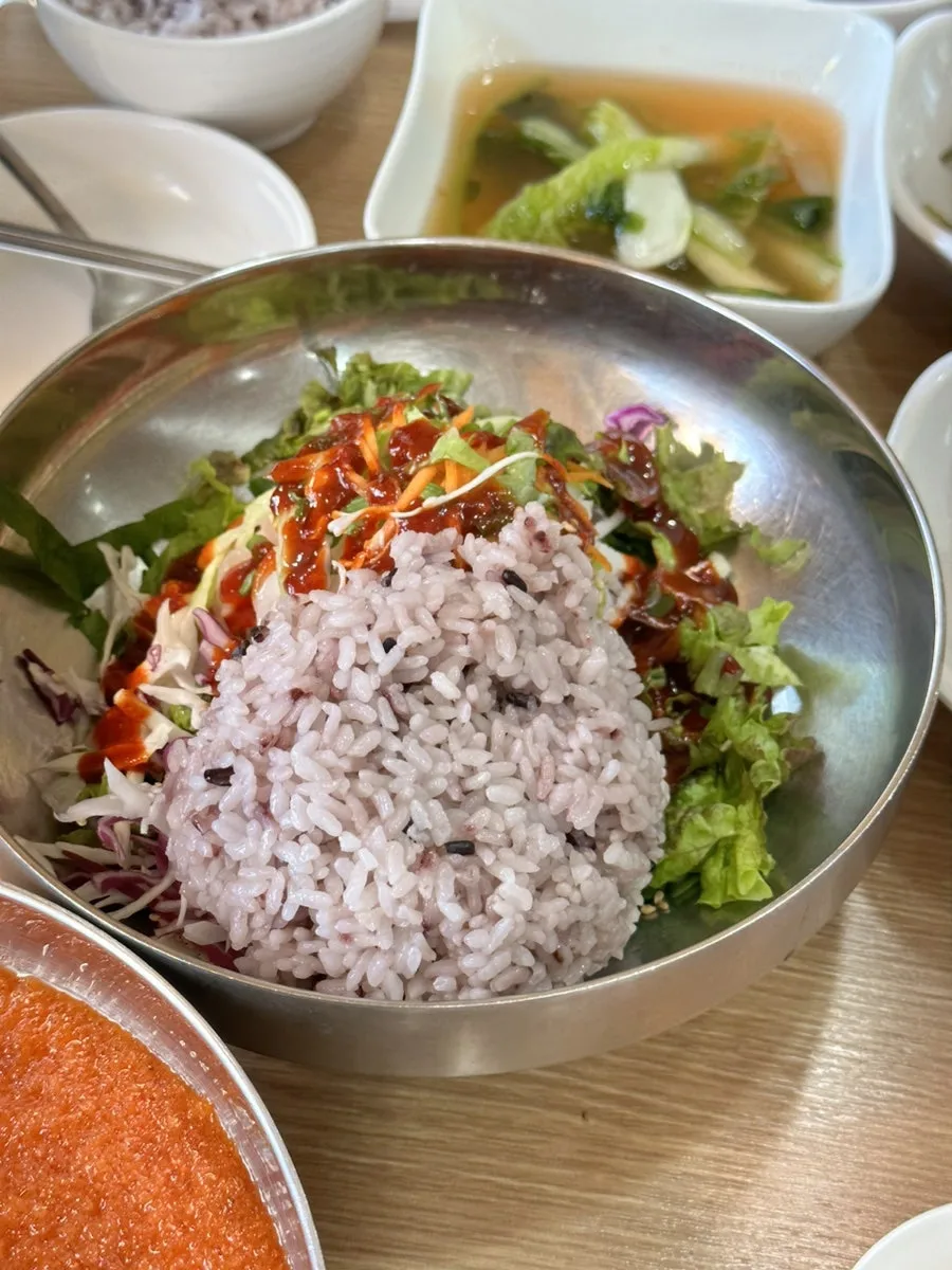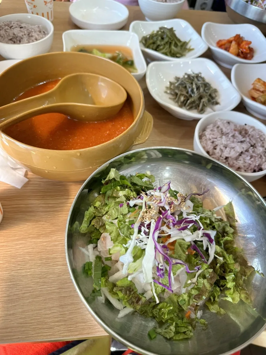 처음에 야채만 주셔서 어떤 게 물회고 어떤 게 회덮밥인지 여쭤봤더니 밥 얹으면 회덮밥이고 육수 넣으면 물회지 하셨다.