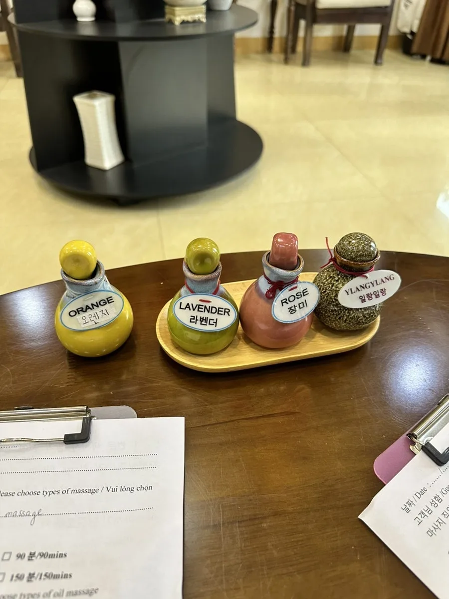 원하는 향을 고르고 마사지 부위와 강도를 적으면 웰컴티를 준다.