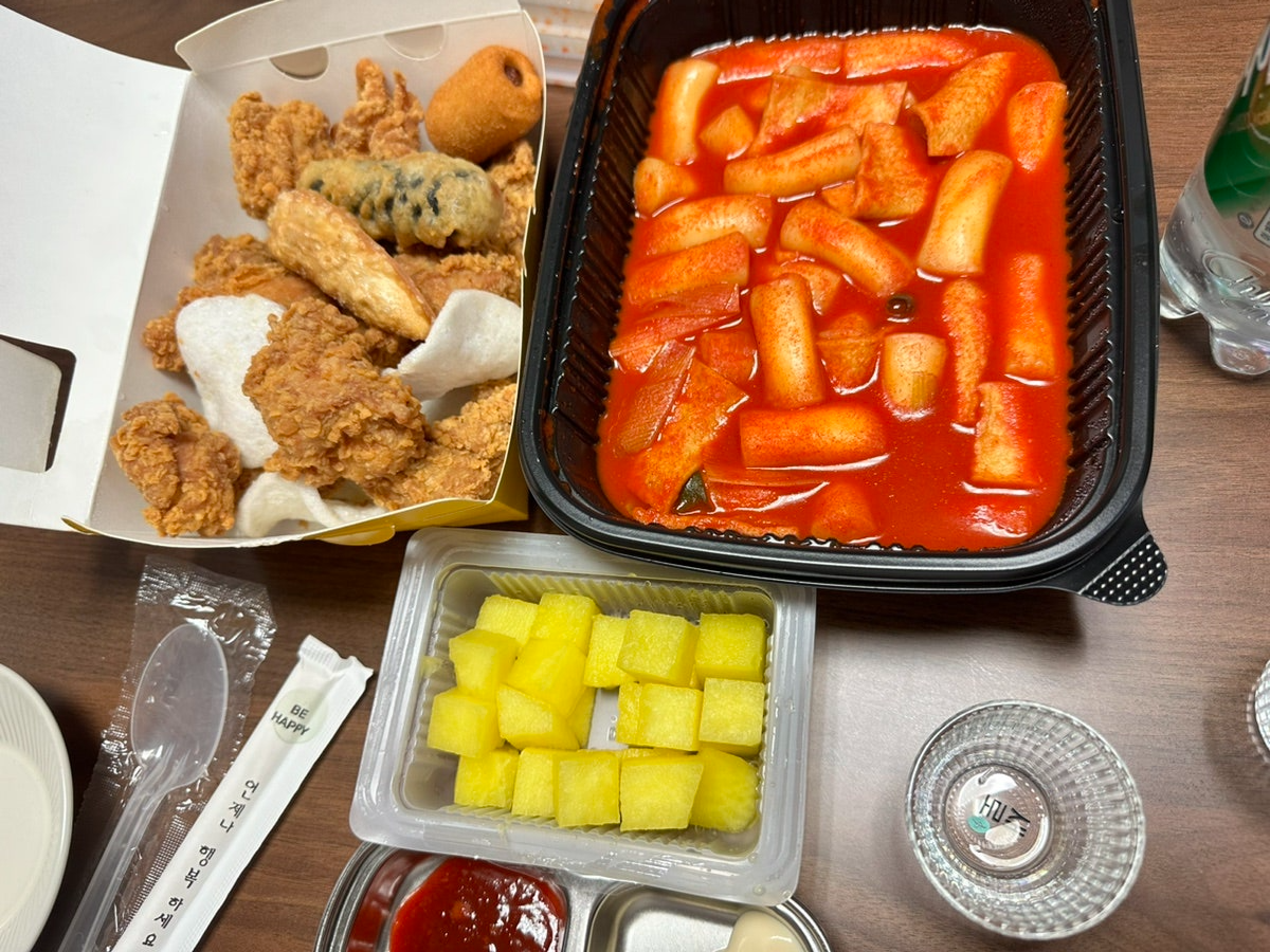 이사 후 거실에 앉아 치킨과 떡볶이에 한잔하기도 했다.