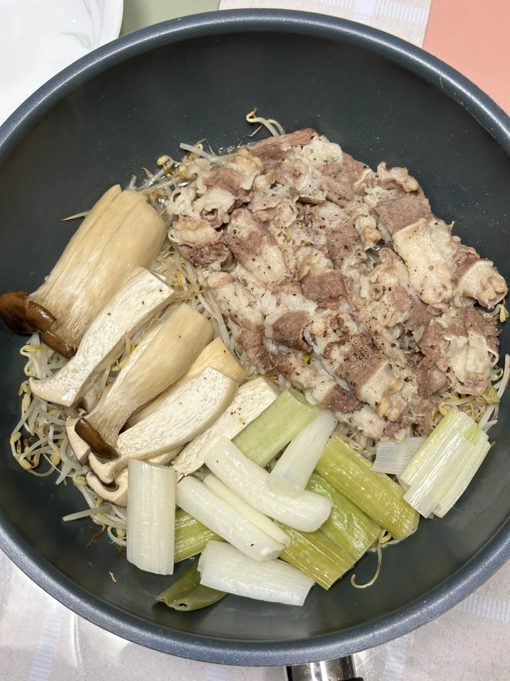 이마트에서 구매한 숙주와 버섯으로 뭘 해 먹을까 하다가 숙주 한 봉지 다 넣고 냉동실에 있던 우삼겹과 대파 넣어 야채찜 해 먹었다.