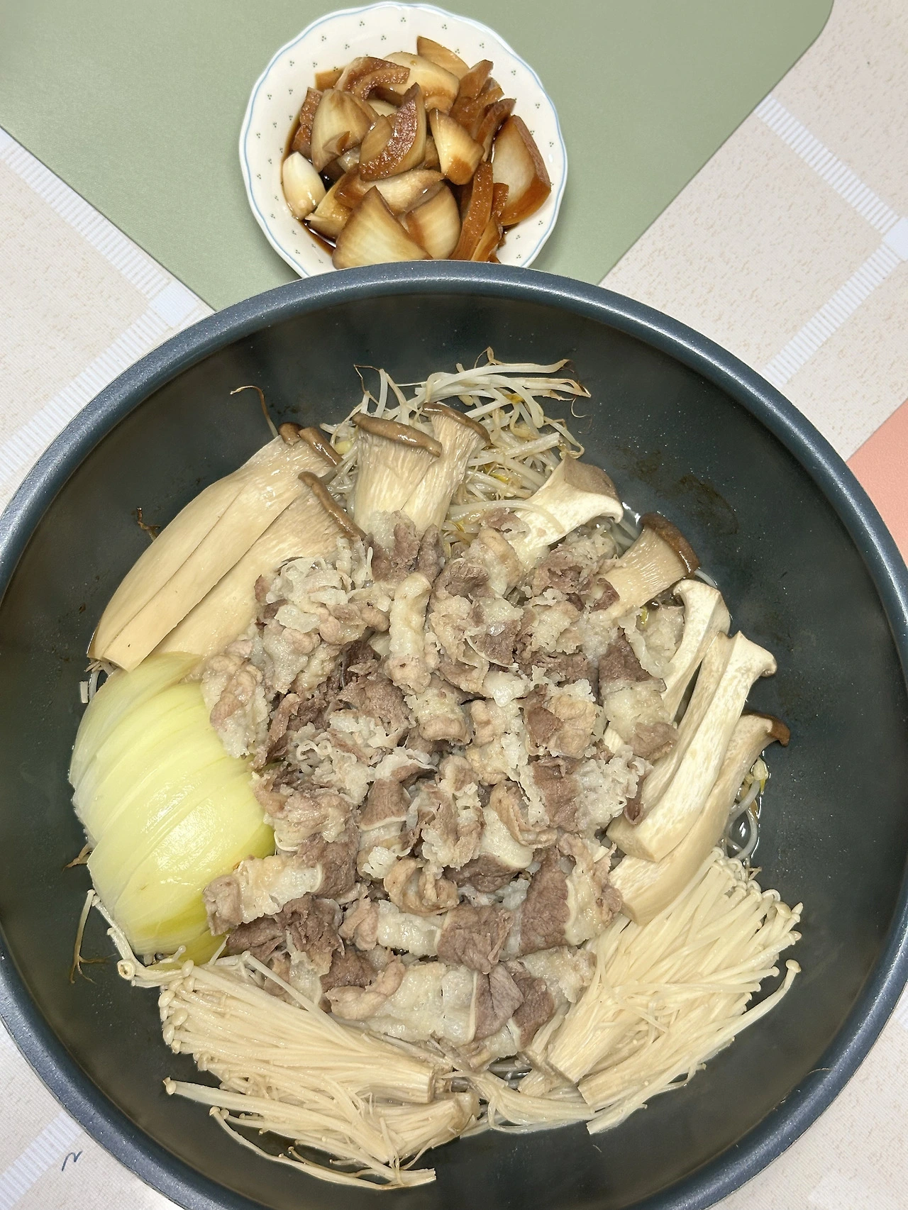 자투리 버섯과 양파를 처치하기위해 오늘은 숙주 우삼겹찜이다.