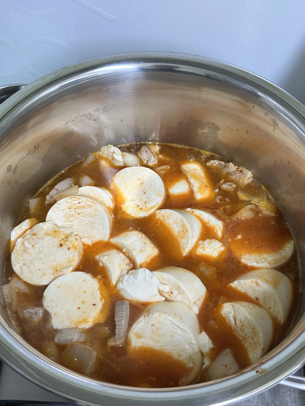 저번에 사둔 두부한모와 김치, 양파, 그리고 냉동실에 묵혀둔 우삼겹으로 만들어줬다.