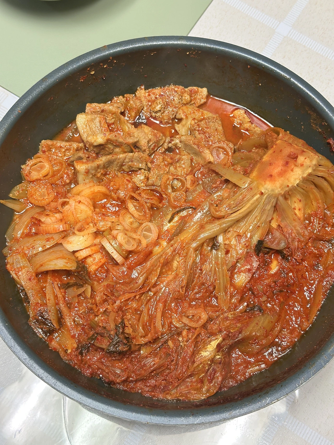 저녁은 비가와서 부침개 먹을까 하다가 매콤한 국물이땡겨 김치찜을 했다.