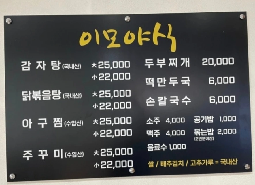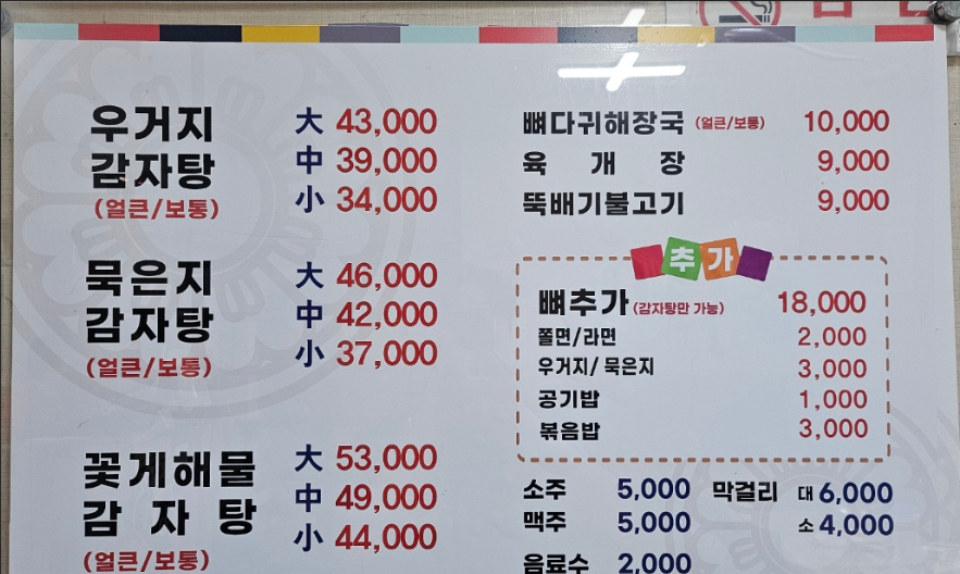 감자탕과 야구찜이 주력 메뉴고 낮엔 저렴한 칼국수도 판매하셔서 단체 점심을 먹곤 했다.