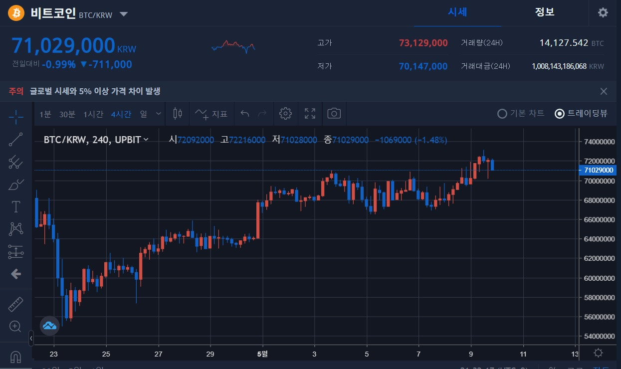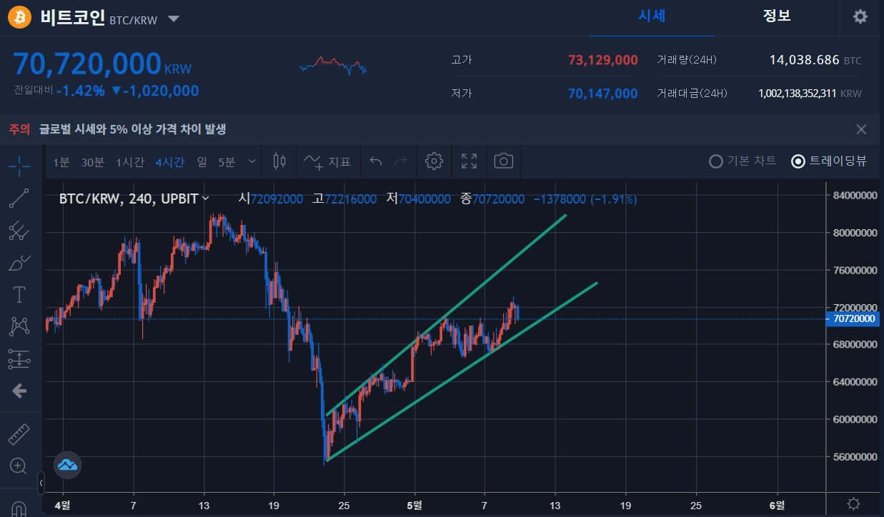 일요일자 4시간 봉 차트입니다. 4월 23일부터 5월 9일까지 우상 향하는 차트를 볼 수 있죠.