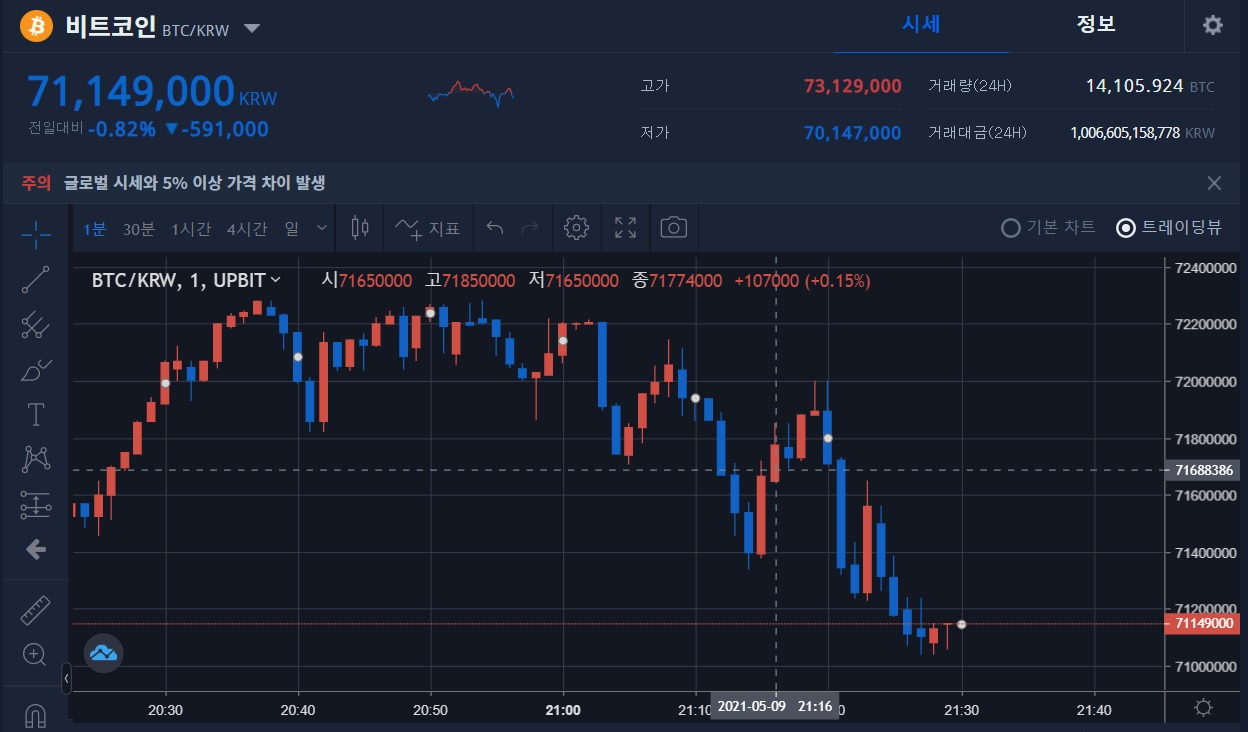 업비트 비트코인 차트에 좌측 상단에 1분을 클릭하면 1분 봉이 나옵니다.