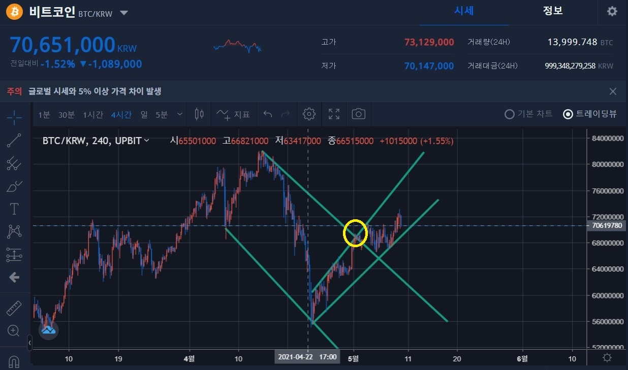 그 이전 4월 말 코인 시장에 난리가 났던 때의 추세선을 추가해보겠습니다.
