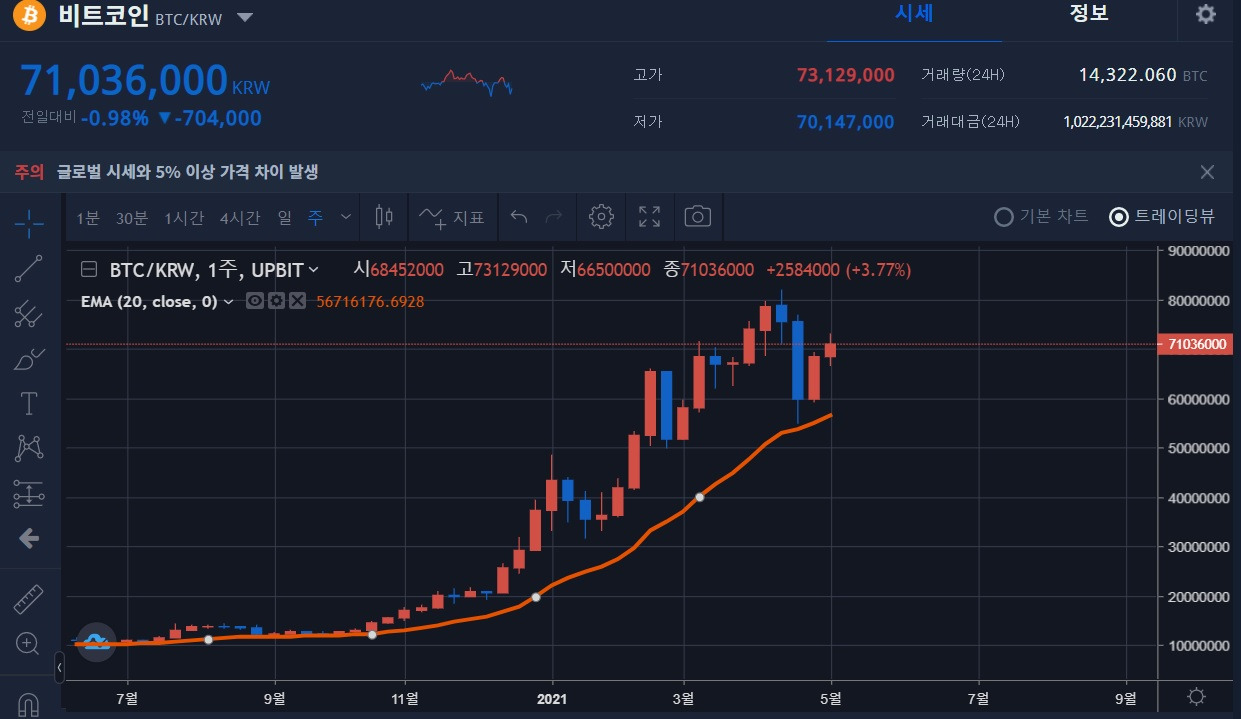 지수 이동평균(20일 기준)으로 그은 선 과 주봉.. 파란색 음봉.. 저때가 비트코인 제제와 여러 악재가 겹쳐 막 하락 하던 4월 말...이었습니다.