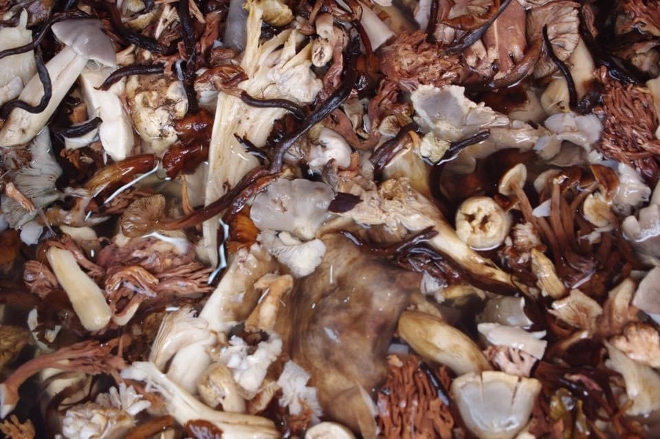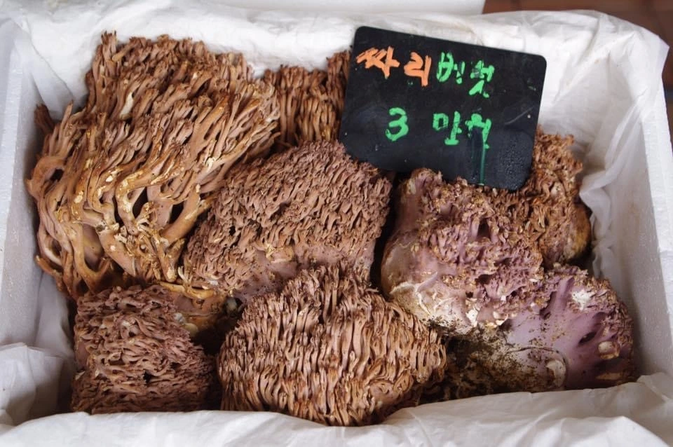 닭벼슬을 닮은 닭머리 버섯, 데치면 색이 변하여 소간같이 식감이 물컹해지는 솔 버섯, 꾀꼬리버섯, 먹버섯, 산느타리버섯, 밤버섯, 싸리버섯 등등 살짝 물에 담가놓은 모습이 라스베이거스 벨라지오 호텔 천장에 있는 Dale Chihuly의 작품보다 아름다웠다.