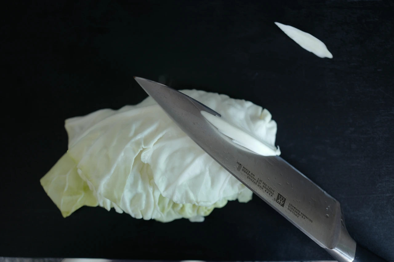 양배추는 이렇게 반을 잘라 심지를 제거한다.