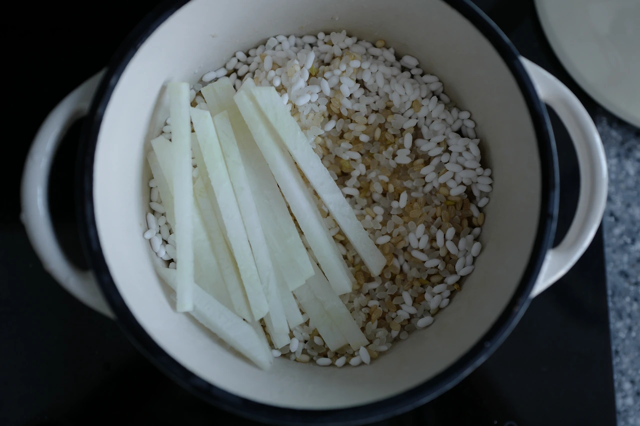 무 100g (기호에 따라 마음껏, 쌀 표면을 덮어줄..)