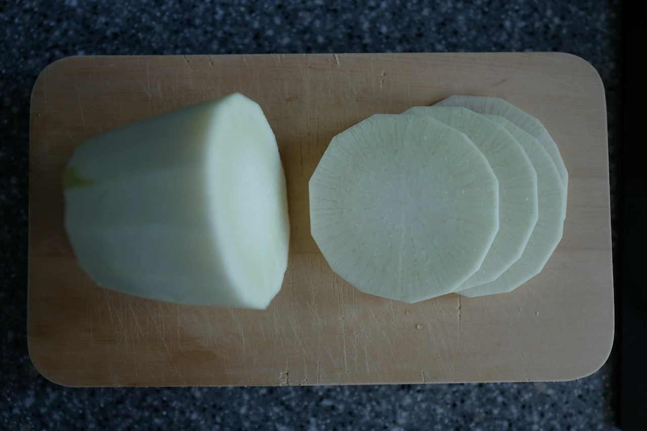 저렇게 가로로 원형으로 자른 후 채를 썰면 무나물에 더 적합하고, 세로로 잘라 채를 썰면 무생채에 더 어울리는 맛이 난다고 한다.