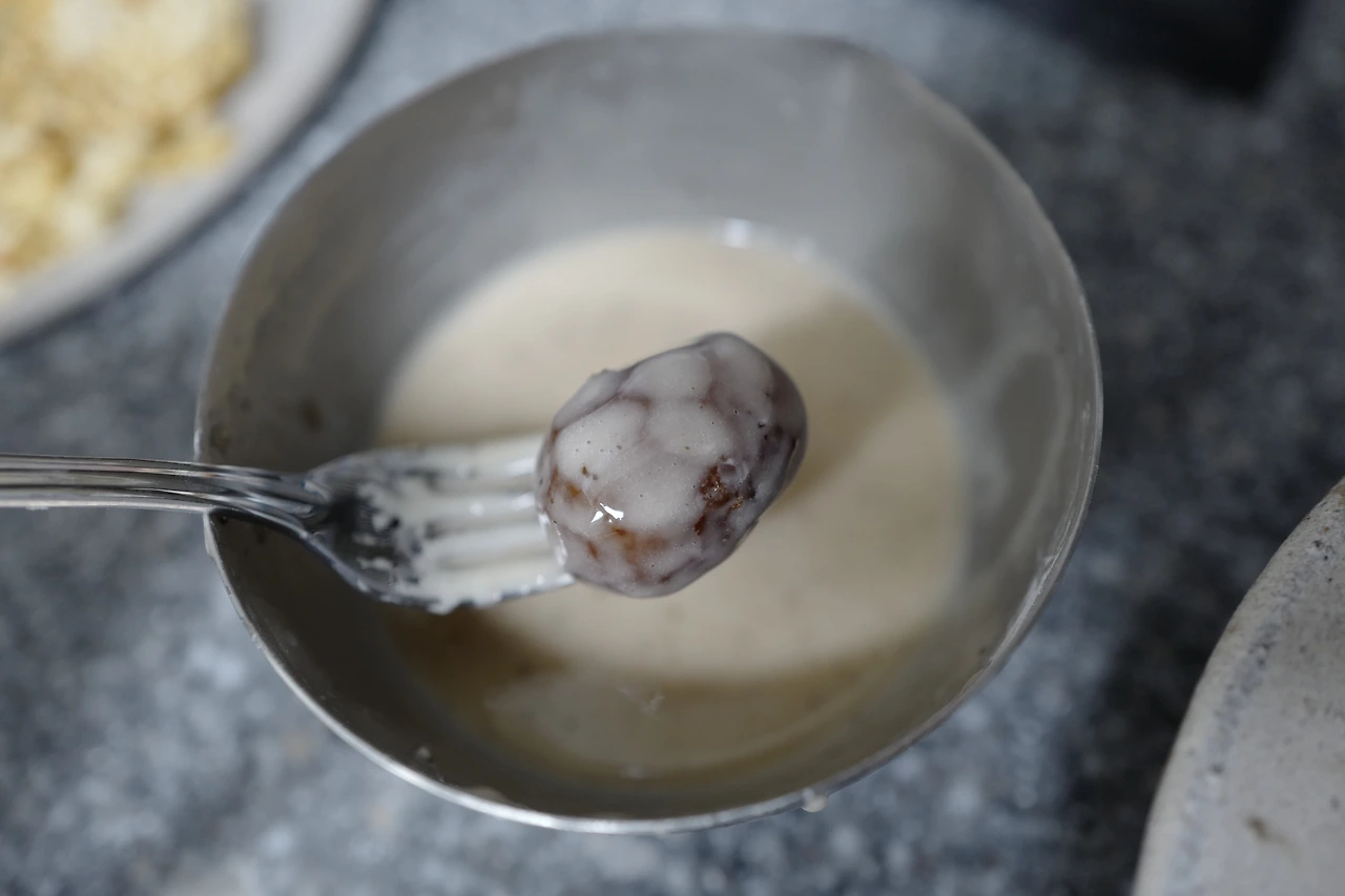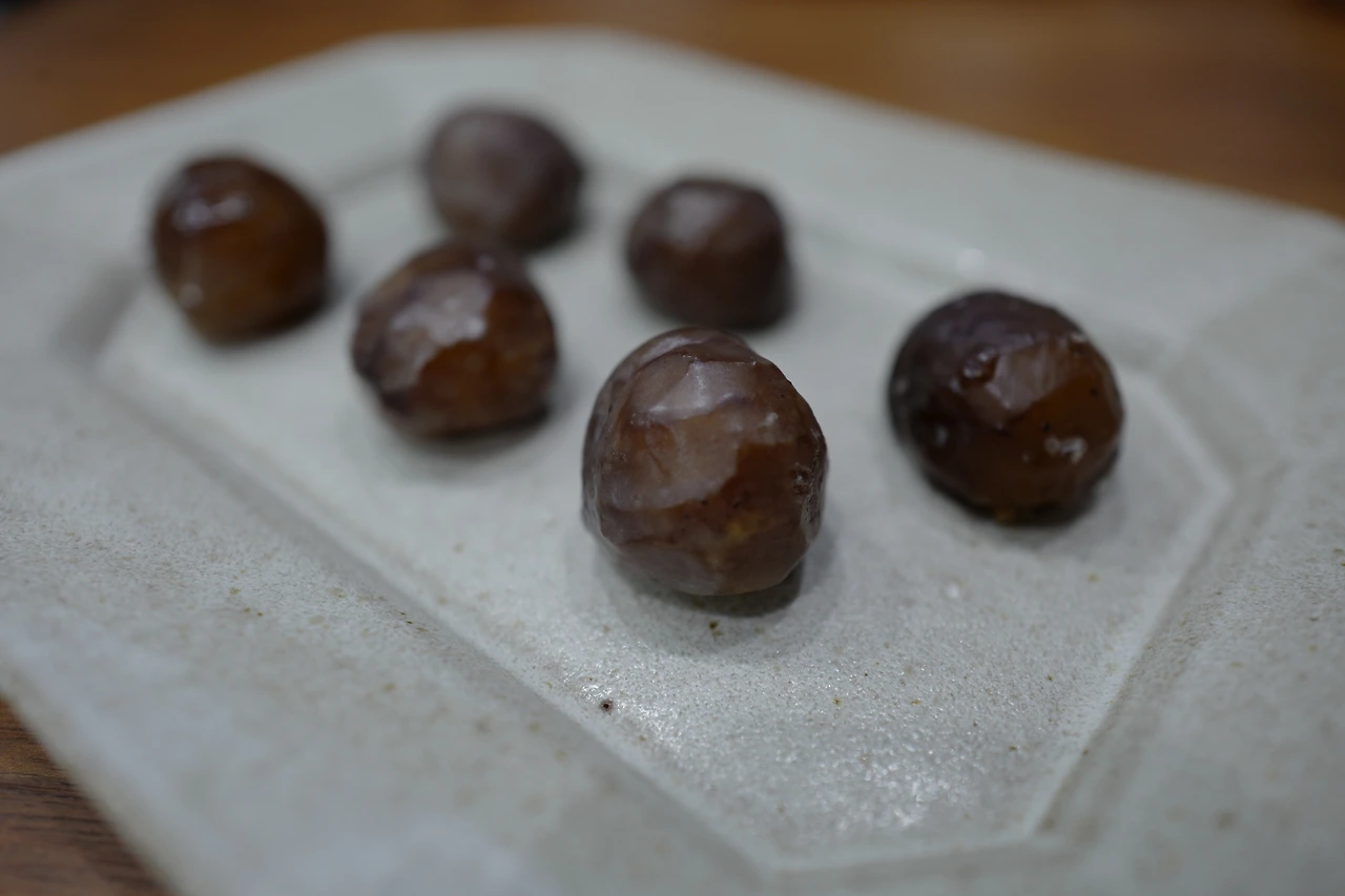 남은 밤 시럽에 슈가파우더를 1:0.5로 섞어 퐁당 옷을 입히면 된다. 연하게 입히려면 시럽을 다시 끓여 투명함을 강조할 수 있다.