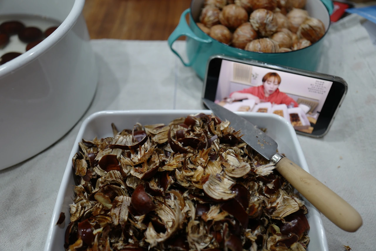 작년에는 마켓 레이지 헤븐에서 구입한 무훈증 추파 밤을 사용했고 올해도 설레는 마음으로 주문해 손질까지 마치고 속껍질을 벗기는 단계에 돌입했는데… 너무나 바쁜 일정에 깜박하고 약한 불에 올려놓고 미팅 나갔다가 태워먹었다는 슬픈 소식.