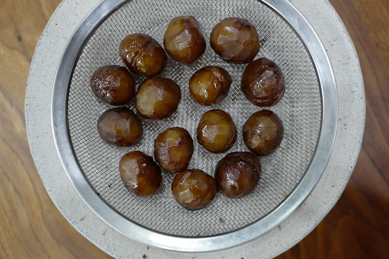 상당히 큰 유혹이 다가온다. 굳이 베이킹 소다 넣고 살짝 끓야가며 속껍질을 이쑤시개로 벗겨야 하는가. 그냥 이 채로 시럽 넣고 간장과 럼 넣고 졸여 보늬 밤을 만들자!