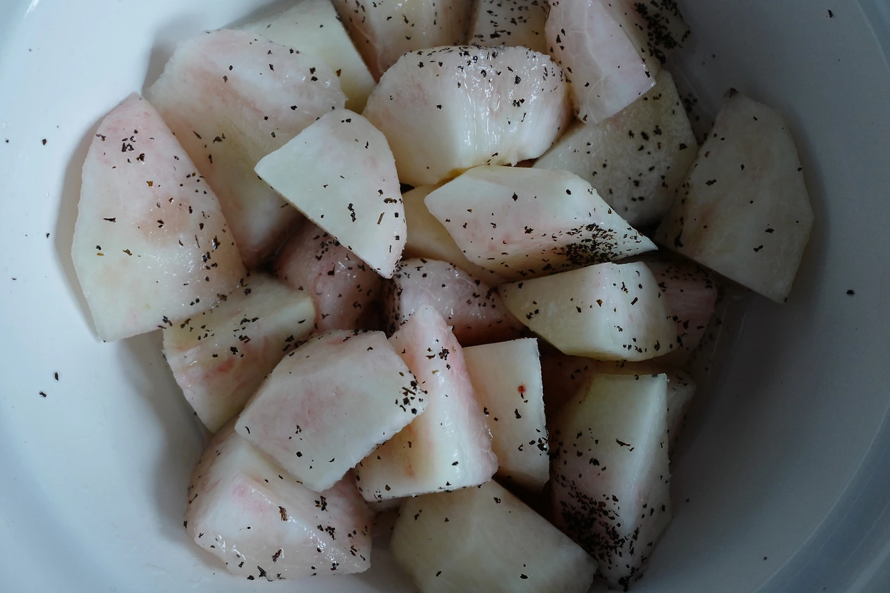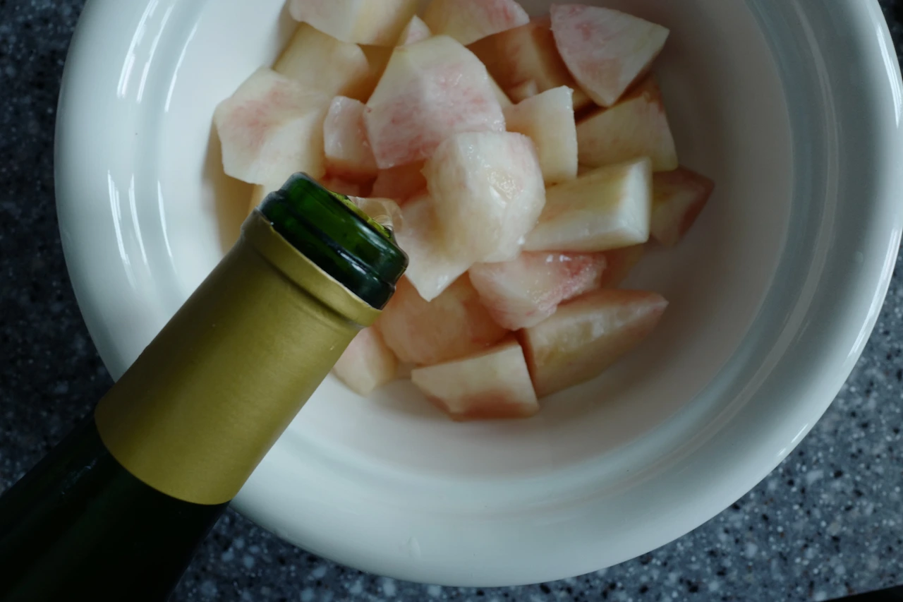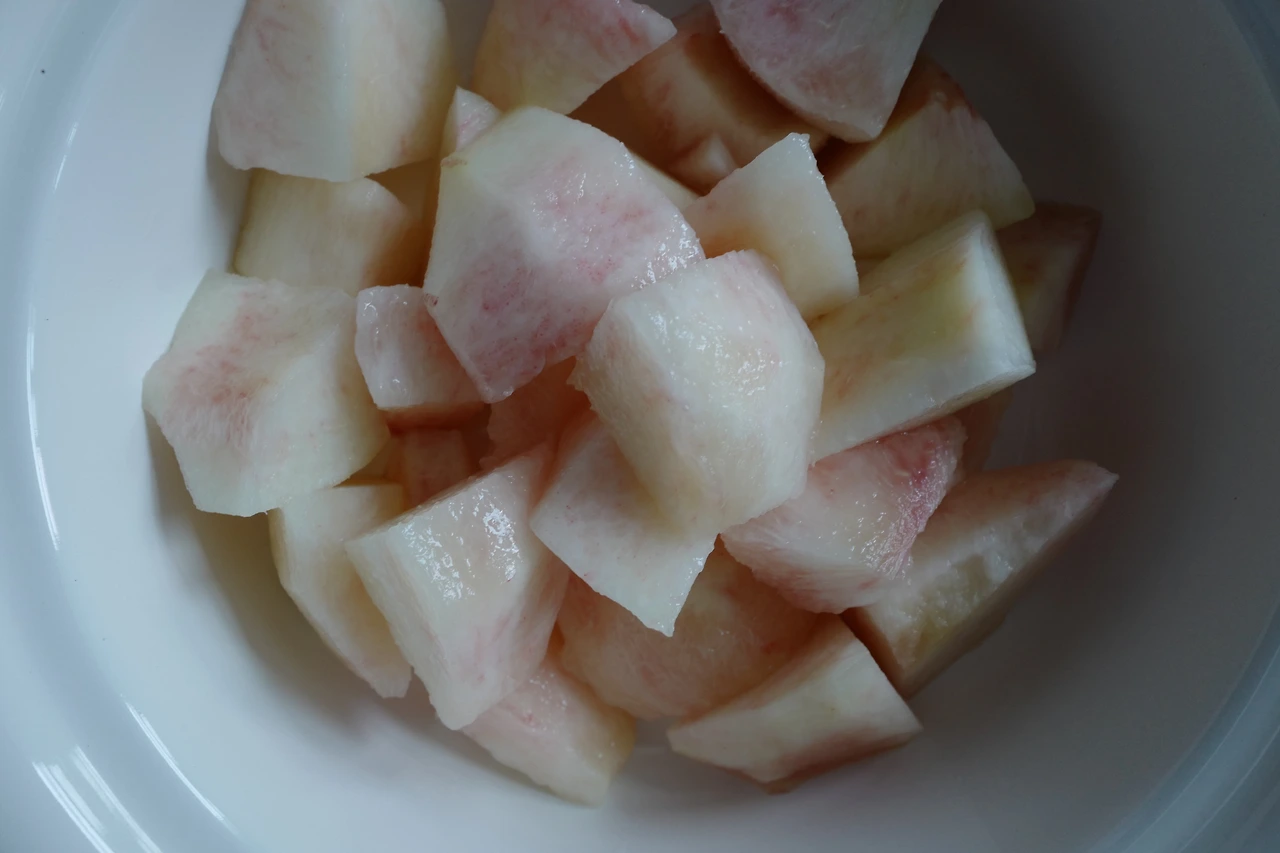 한 입 크기로 잘 자른 복숭아를 볼에 담는다.