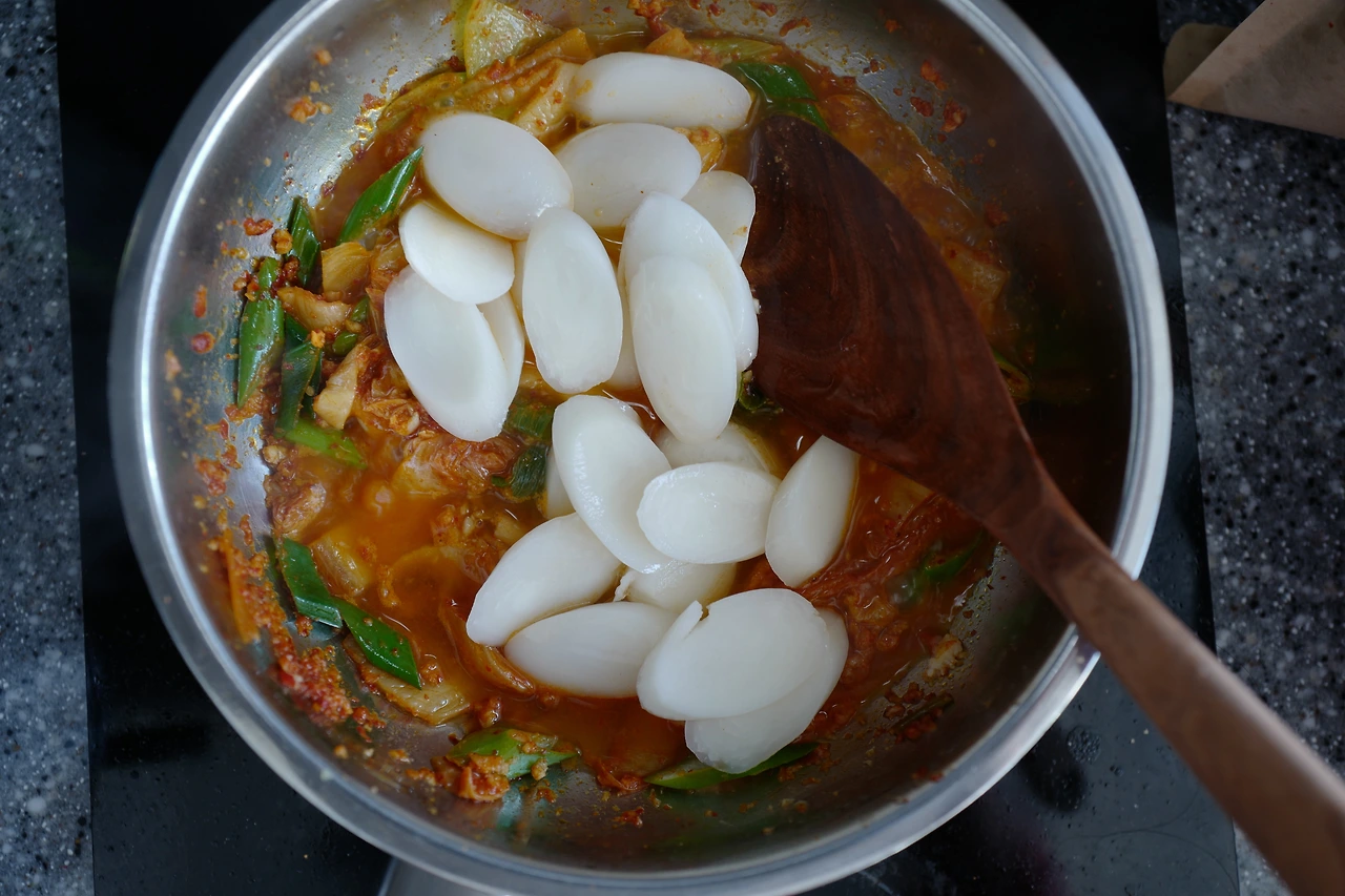 떡을 건져내 팬에 넣고 자박하게 육수를 더한다.