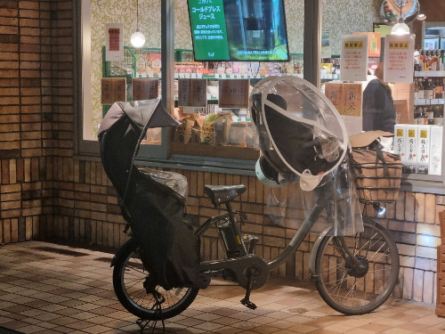 일본의 한 마트 앞에 세워진 전동 마마챠리. 두 아이를 앞뒤로 태우고 장 본 물건까지 담을 수 있다.