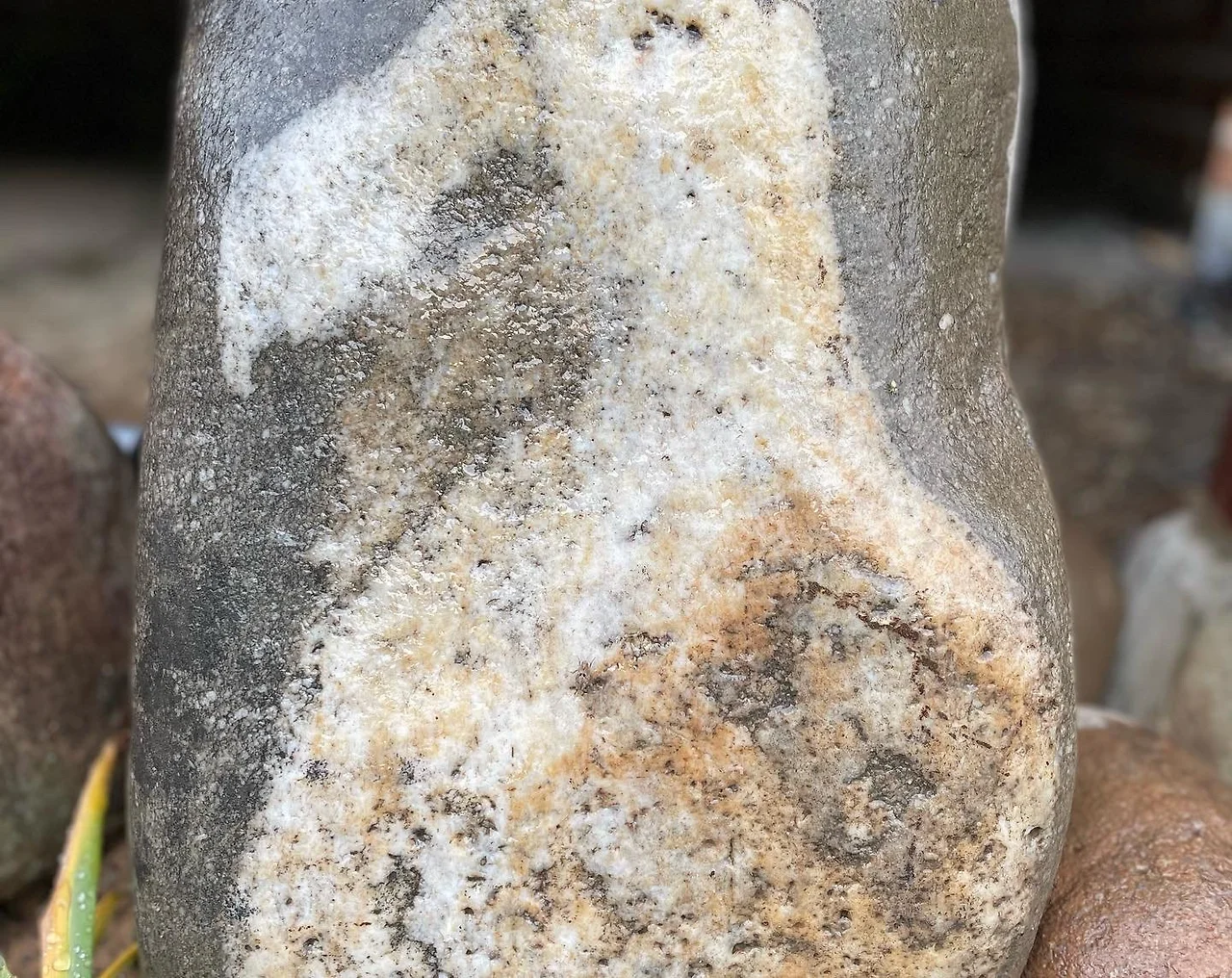 이 집을 사기 전에 맨처음 방문했을 때부터 커다란 바위가 있었다. 어느날 우연히 그 바위에서 슬프고 우울한 표정의 할아버지 얼굴이 보였다. 이번에 토목공사를 하면서 어찌어찌 앞 화단에다 이 집의 지킴이 돌로 두었는데, 신기하게도 할아버지가 편안히 잠자는 표정으로 바뀌었다.