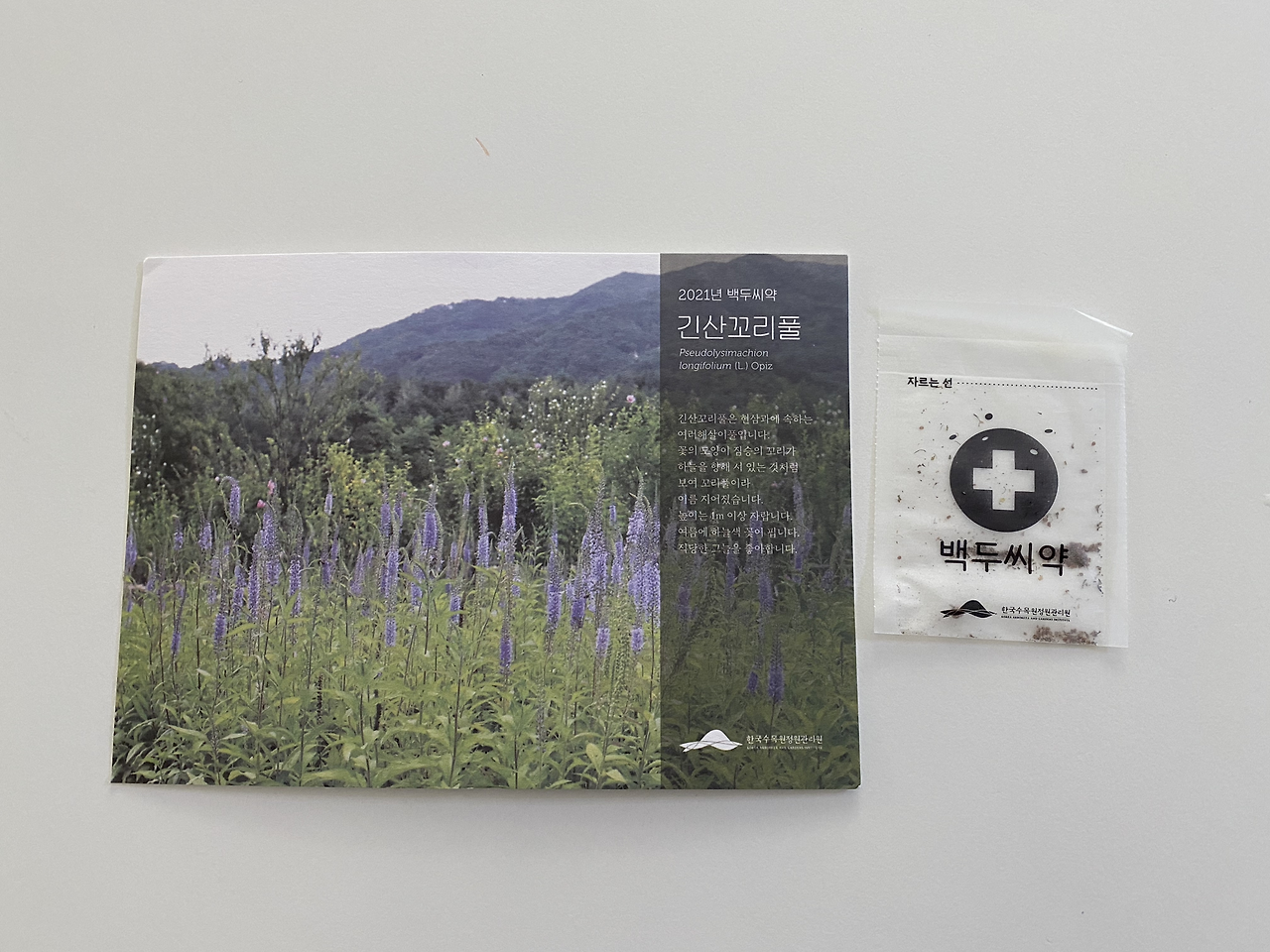 그리고 아이들과 함께라 챙길 거 많고, 바쁜 와중에 무료 배포한 엽서를 하나 챙겨 왔다. 챙기긴 했는데 갔다 와서 한동안 서랍에 넣어두었다. 있는지도 모르게… 그런데 며칠 전에 우연히 발견하게 되었다. 그때 가져왔던 그 엽서였지! 사진을 보니 어디서 많이 본 거 같은 풀이었다. 이름이…긴산꼬리풀?