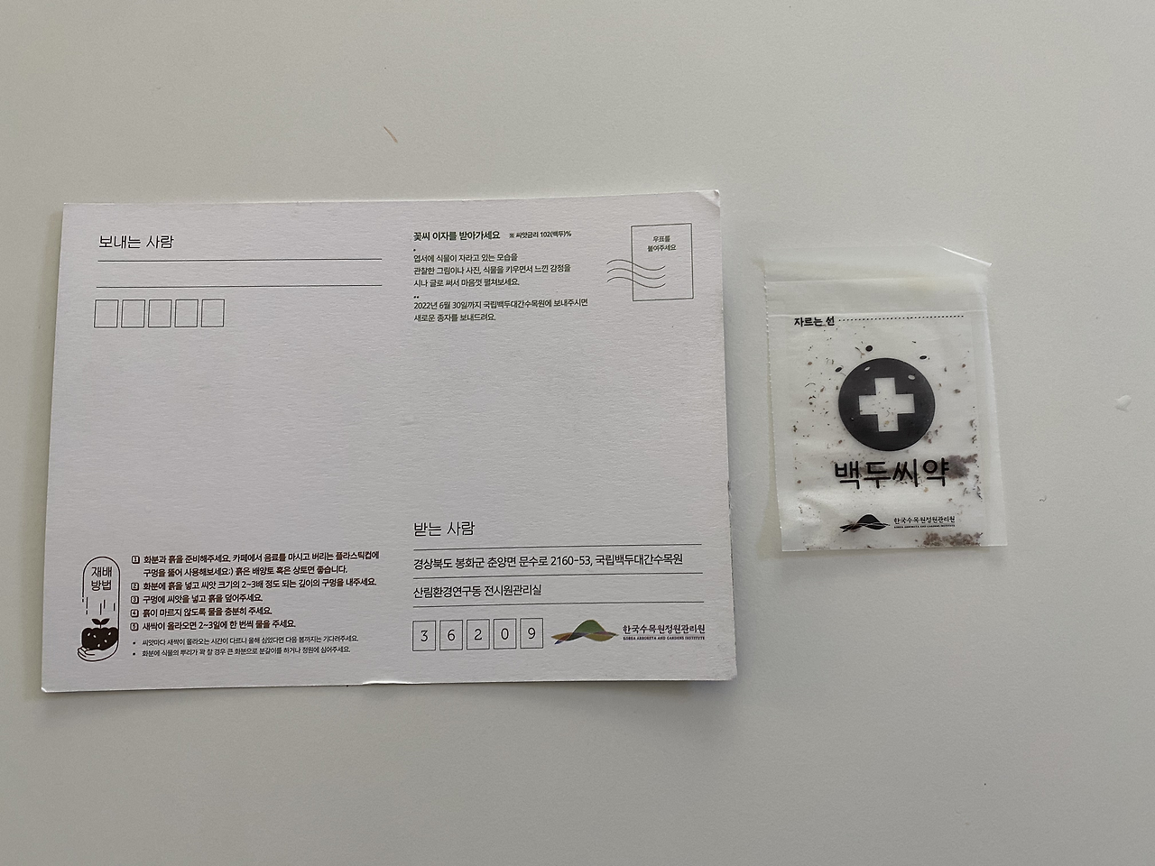 2022년 6월30일까지 국립 백두대간 수목원에 보내주시면 새로운 종자를 보내드려요.