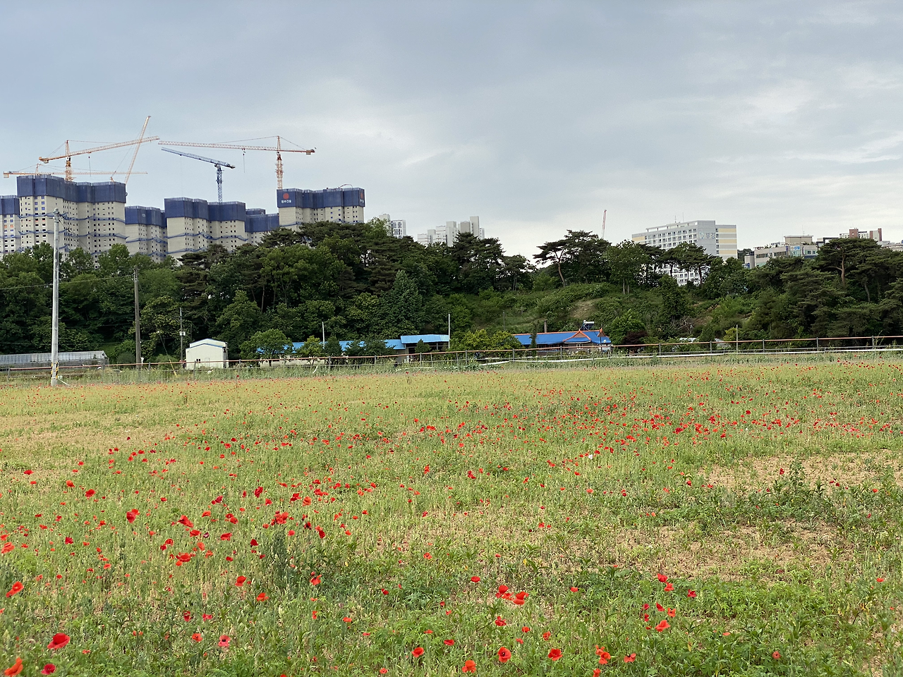 길을 따라 더 가보았습니다. 떨어진 곳에 아파트 건설 현장이 있었습니다. 가까이 빈들에는 이렇게 빨간 양귀비들이 피었습니다. 누가 심어놓은 것 같지는 않습니다. 그런데 자연스럽게 피어 눈길이 갔습니다. 구름 많은 날씨에도 꽃잎이 선명하게 보입니다. 마치 빨간 물감으로 점을 찍은 듯 눈에 띄었습니다.