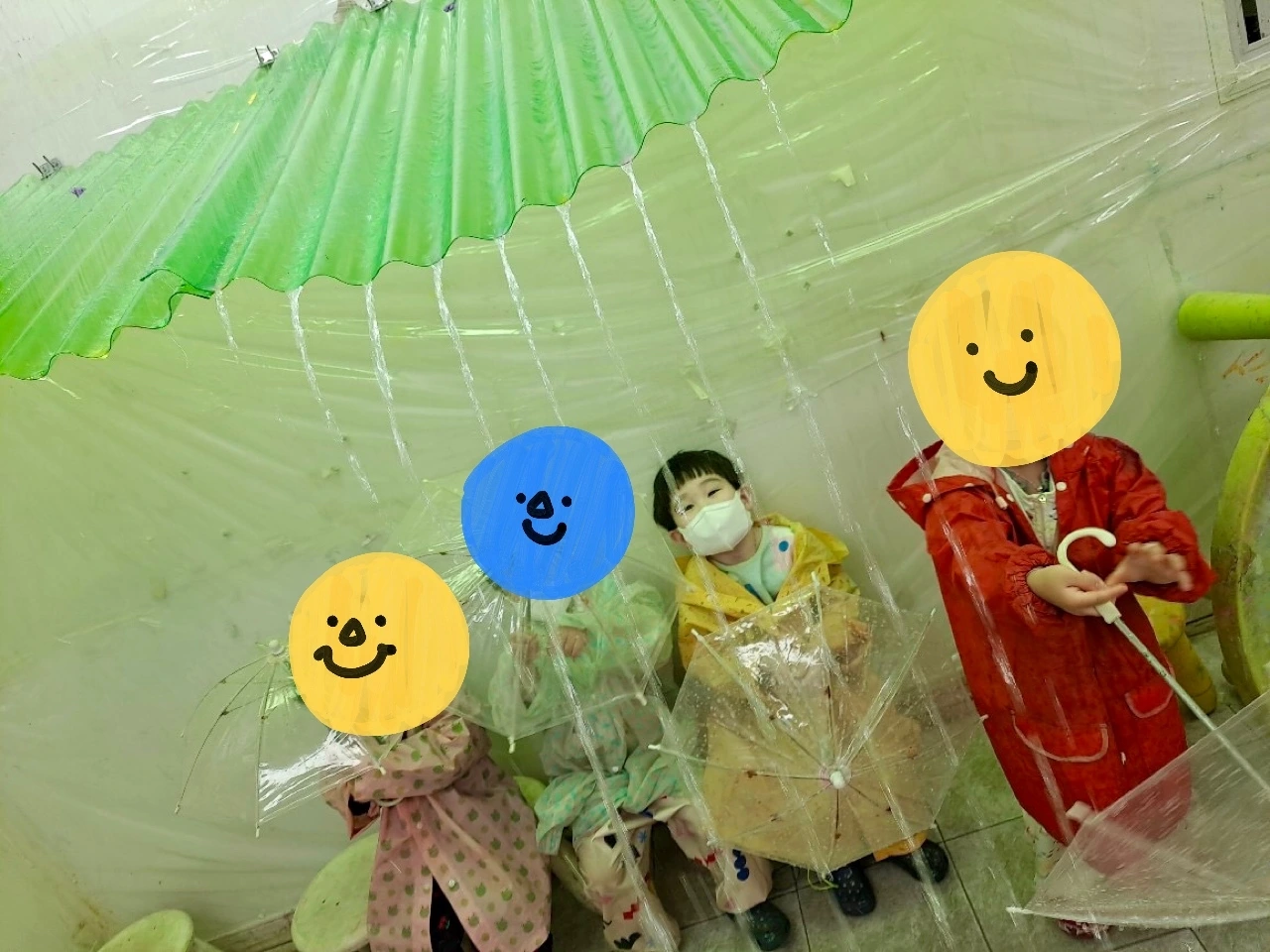 끝으로, 흘러내리는 빗물의 성질을 이용한 놀이입니다. 이 쯤, 1호는 우비를 입은 모양입니다. 물을 싫어하는 1호… 친구들과 빗물 놀이하는 모습을 직접 보니 대견하다는 생각이 듭니다. 물에 젖는 것을 싫어하는 아이가 빗물 놀이라니… 참 많이 좋아졌구나 생각되었습니다. 우산도 들어 써보고 비가 떨어지는 곳에 여러 번 갖다 대어 보기도 합니다.